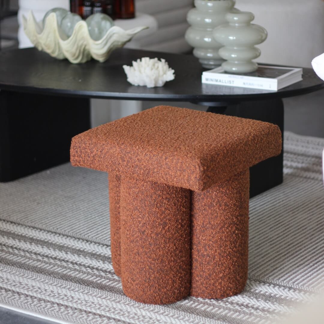 הדום חמרה מבד בוקלה בצבע טרקוטה עם שילוב שחור. הדום בעל רגליים מעוגלות. מתאים כתוספת לסלון, פינת איפור או לצד מיטה.