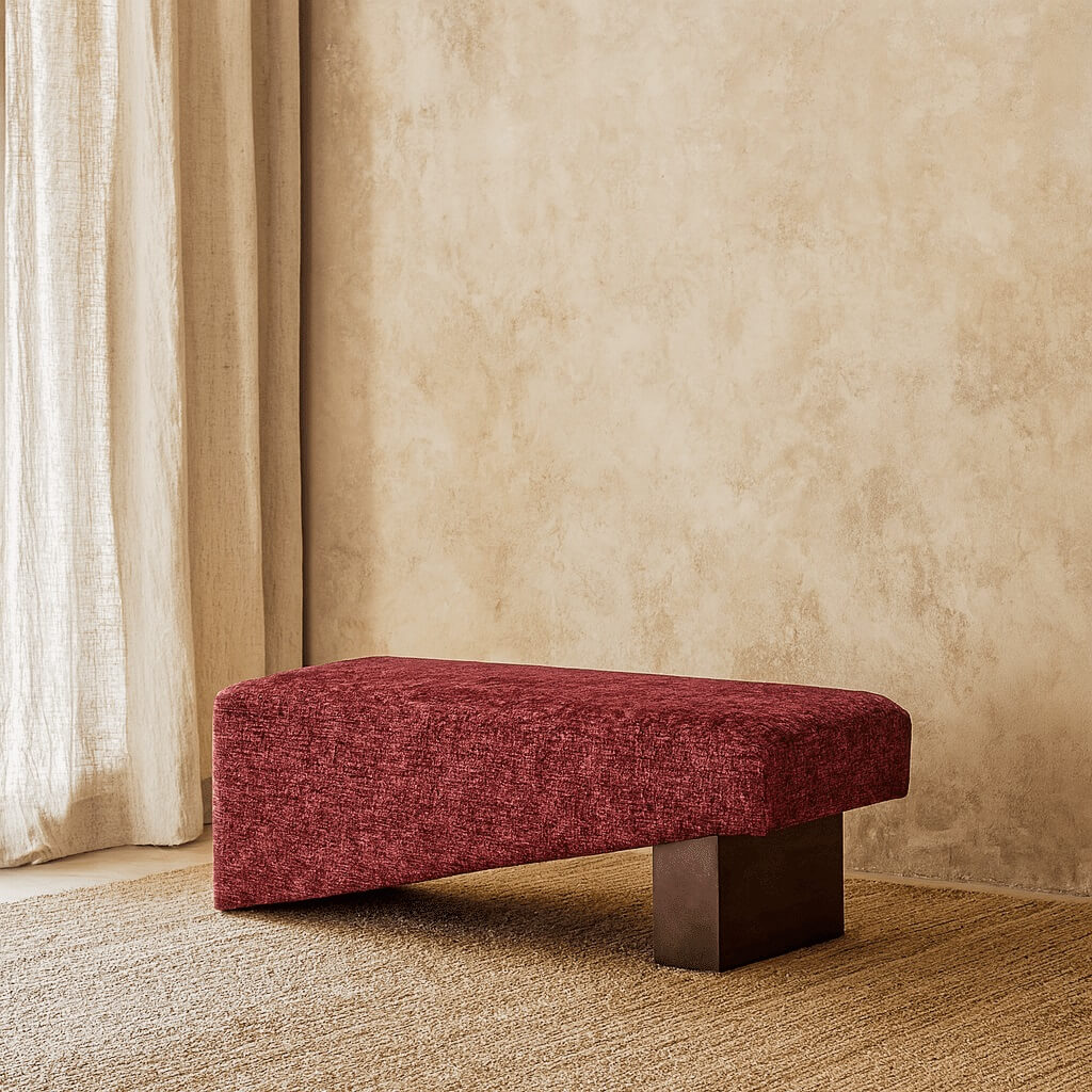 ספסל משולשים עם בד מטריף בצבע בורדו עם רגל מעץ מלא בצבע עץ אגוז.