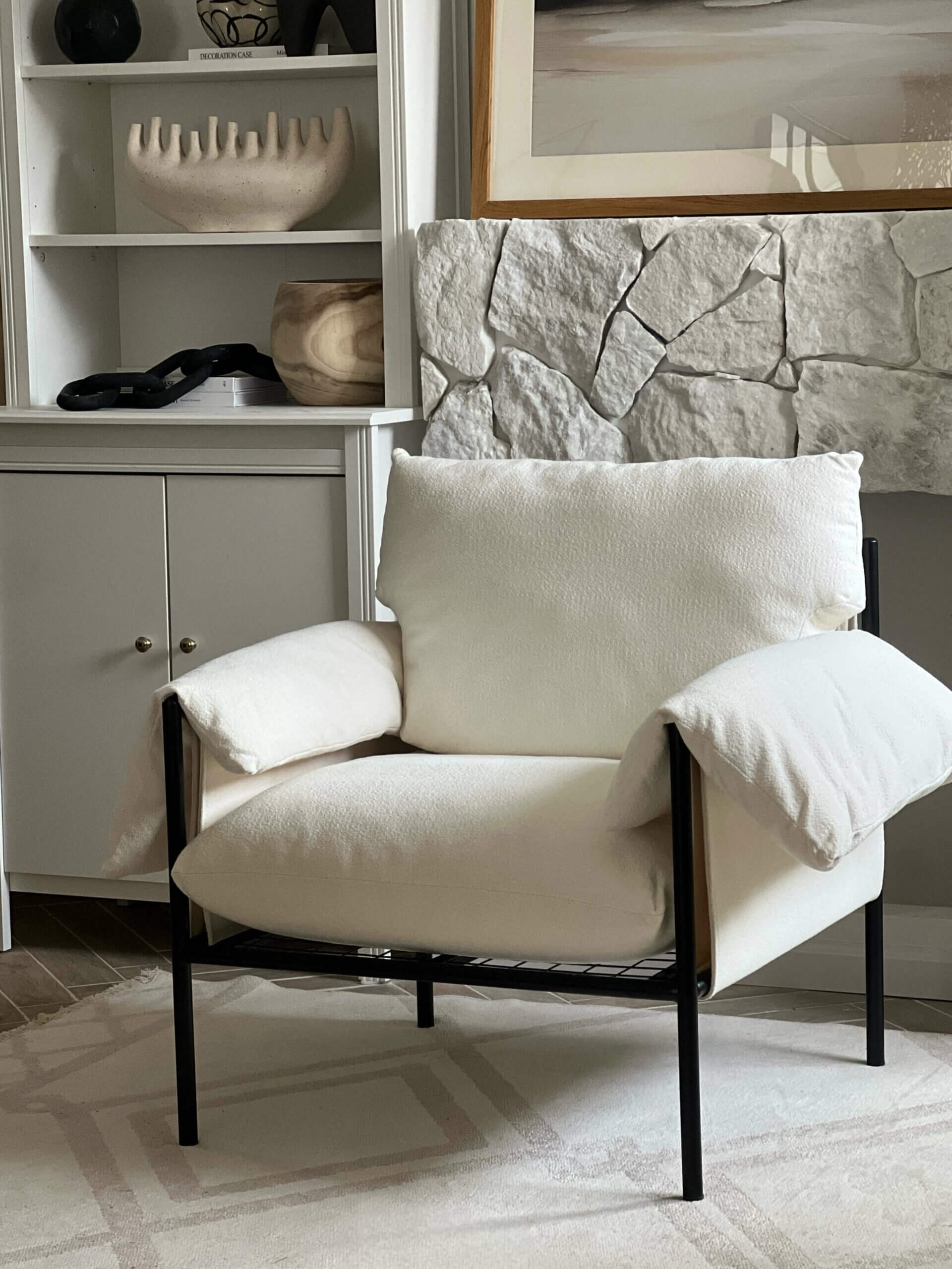 כורסת פינוק מבד בוקלה שמנת עם רגל פליז.
