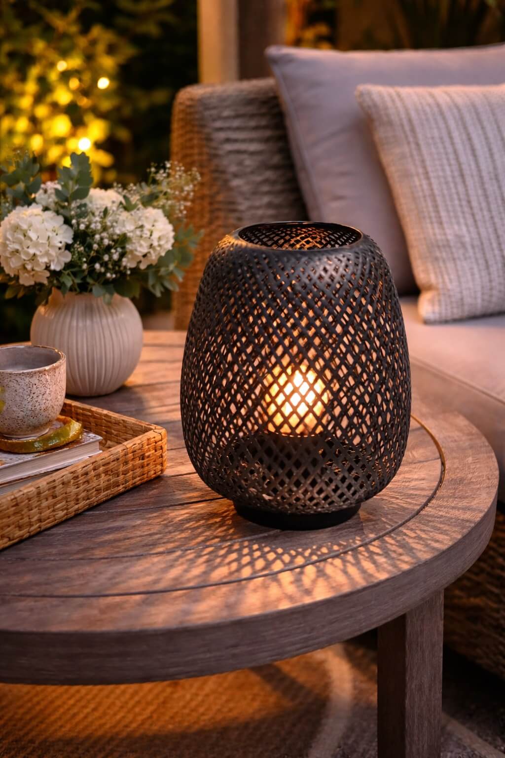 האור הנשבר דרך האהיל המחורר יוצר משחקי אור עדינים ומוסיף חמימות ונוכחות דקורטיבית לשולחן, שידה או קונסולה.