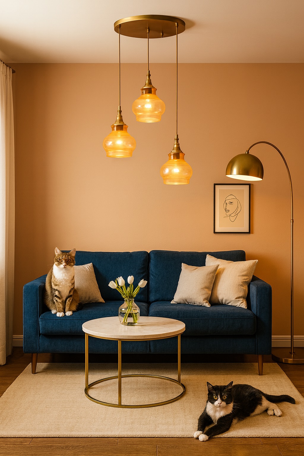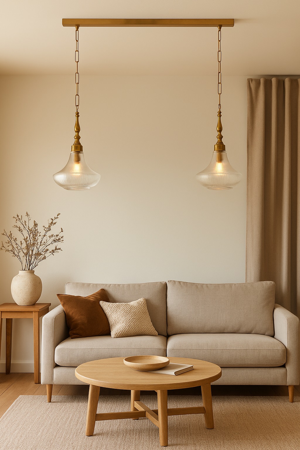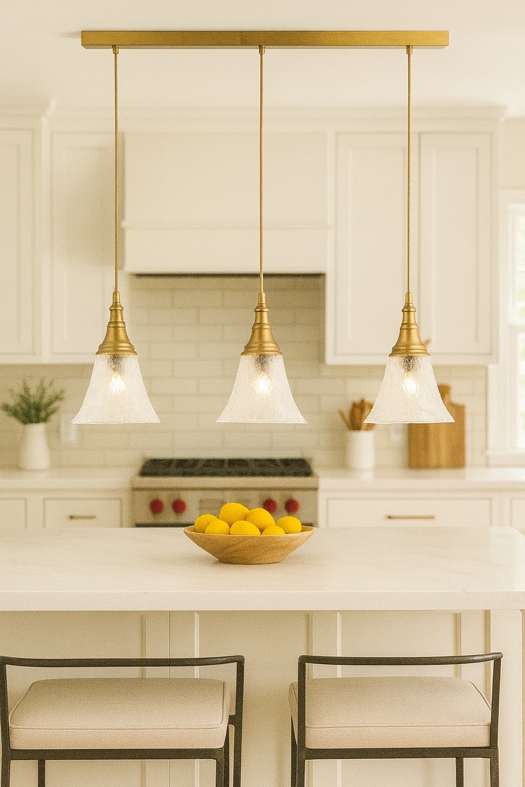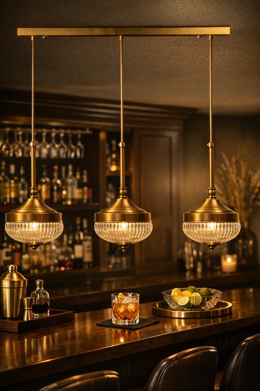 גוף תאורה אלגנטי ויוקרתי בעל שלושה אהילי זכוכית מעוצבים, המשתלבים בצורה מושלמת עם גימור מתכת בצבע נחושת. שילוב החומרים מעניק מראה קלאסי-מודרני המוסיף חמימות וסטייל לכל חלל – במיוחד מעל אי מטבח, פינת אוכל או בר.