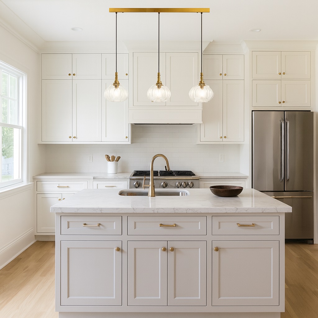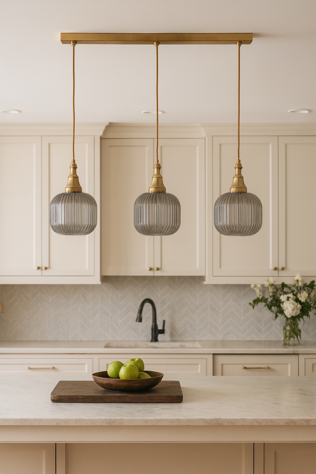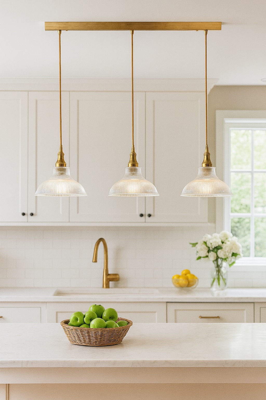 גוף תאורה מרשים בעל שלושה אהילי זכוכית מעוצבים, המשלבים מראה קלאסי עם טאץ' יוקרתי של נחושת. הזכוכית המחורצת מפזרת אור רך ונעים, ומתאימה במיוחד לתאורת אי במטבח, פינת אוכל או חלל מרכזי בבית.