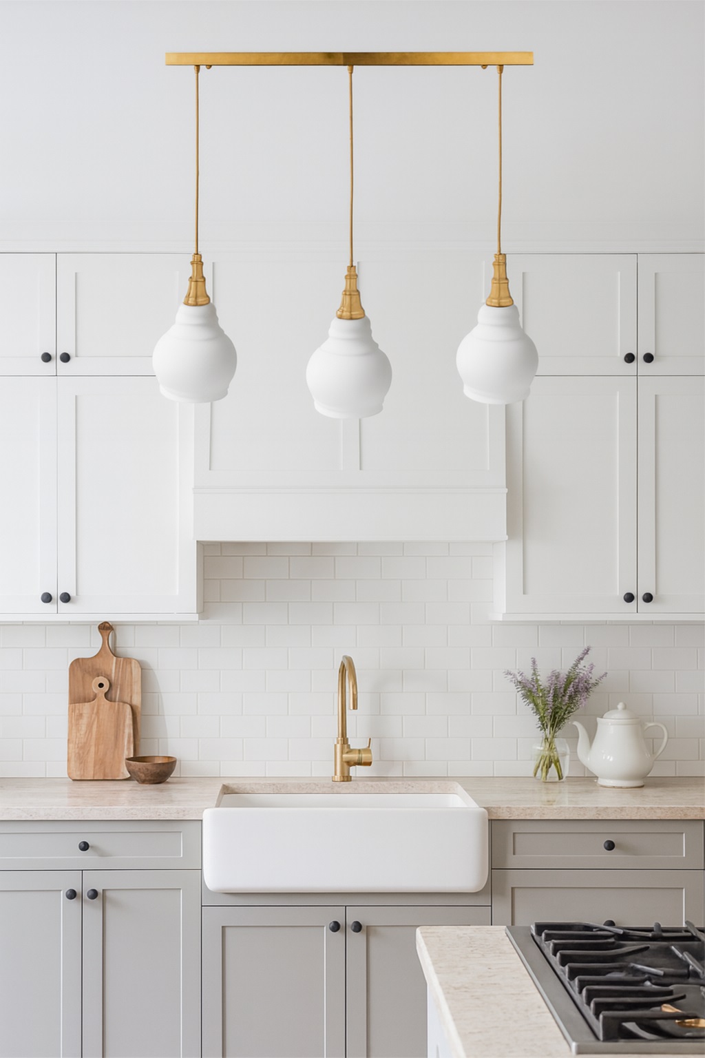 גוף תאורה מרשים בעל שלושה אהילים לבנים מעוצבים, משתלשלים מפס נחושת באורך מטר. מעניק תאורה חמה ואסתטיקה נקייה לכל חלל – במיוחד לפינת אוכל או אי מטבח.