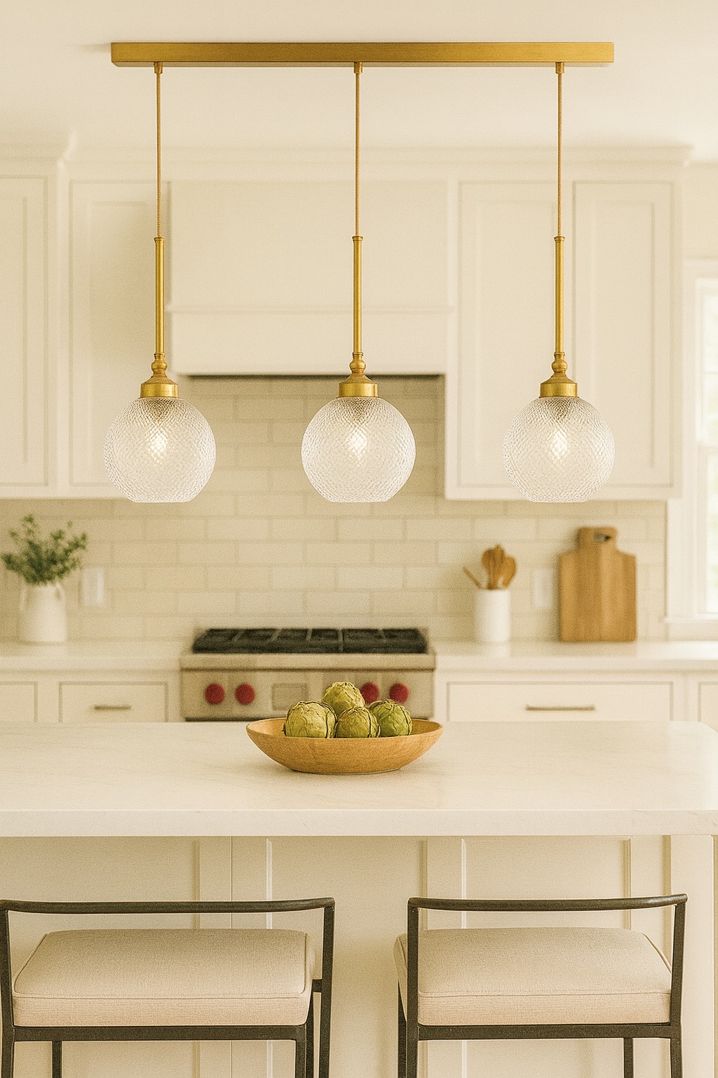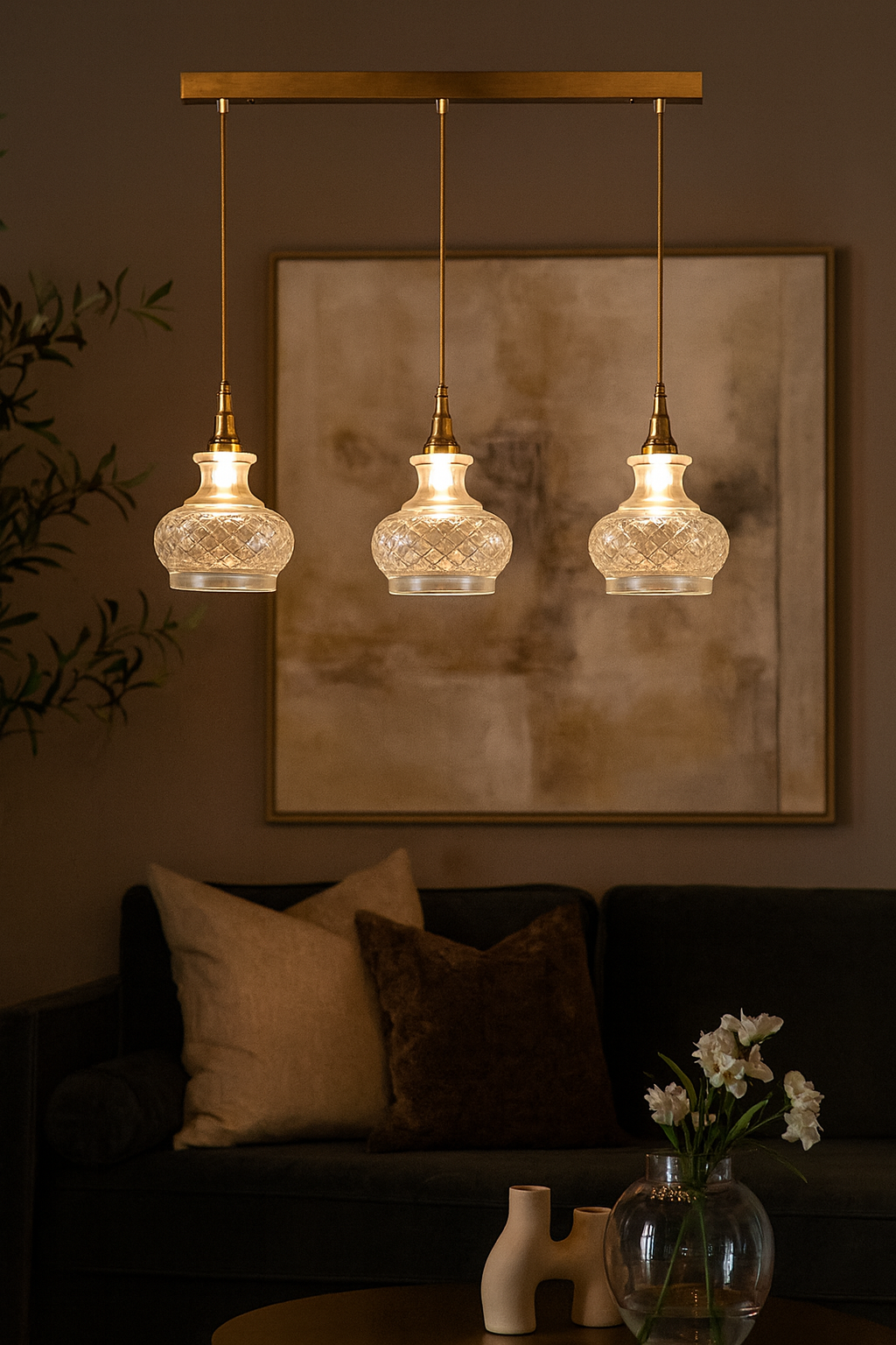 גוף תאורה יוקרתי הכולל שלישיית אהילים מזכוכית מעוטרת, המשתלבים עם פס מתכת בגימור נחושת למראה קלאסי־מודרני. אידיאלי לפינות אוכל, מטבח או חלל מרכזי המבקש תאורה אלגנטית ומיוחדת.