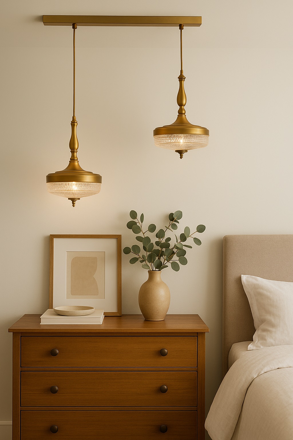 גוף תאורה מושלם בעיצוב קלאסי-יוקרתי, הכולל שני אהילי מתכת כוכית מעוצבת בגימור נחושת מהודר. השילוב בין הזכוכית המחורצת לבין פרטי המתכת יוצר תאורה חמה, אלגנטית ומדויקת – אידאלית לאי מטבח, פינת אוכל או כל חלל הדורש נוכחות מרשימה.