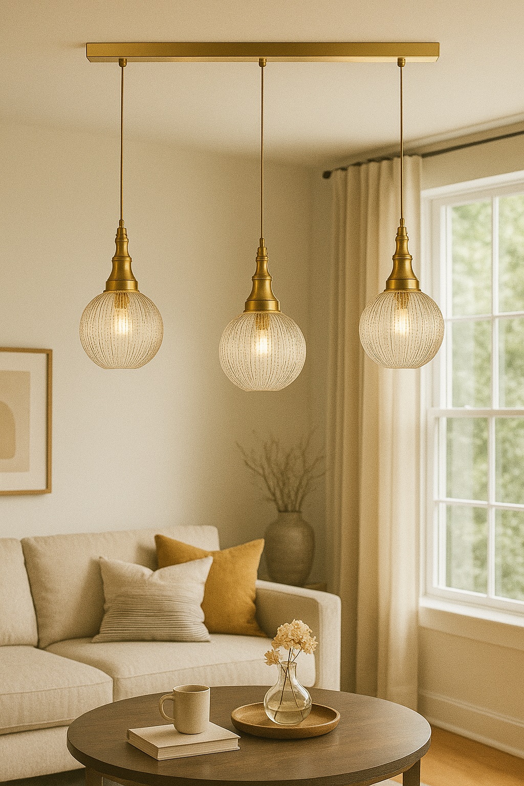 גוף תאורה אלגנטי בעיצוב יוקרתי, הכולל שלושה אהילי זכוכית כדוריים עם טקסטורה עדינה המשולבים בגימור מתכת בצבע נחושת. התאורה הרכה המשתקפת דרך הזכוכית יוצרת אווירה חמה ומזמינה – מושלם לאי מטבח, לפינת אוכל או לכל חלל הדורש נגיעה של סטייל.