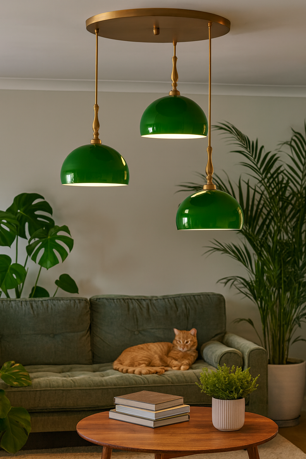 גוף תאורה מרשים בעיצוב ייחודי, המשלב צלחת נחושת עגולה עם שלושה אהילים ירוקים מדגם AM320. השילוב בין נחושת חמה לבין זכוכית ירוקה יוצר מראה עשיר ומוקפד, המוסיף עומק וצבע לכל חלל – אידיאלי מעל אי מטבח, פינת אוכל או פינות אירוח.