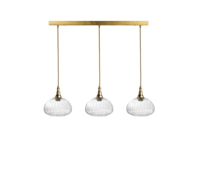 גוף תאורה אלגנטי בעל שלושה אהילי זכוכית מחורצים, המשתלשלים מפס נחושת באורך מטר. המראה הקלאסי והנקי מתאים במיוחד לפינת אוכל, אי במטבח או כל חלל הדורש תאורה מרשימה ועדינה.