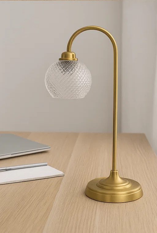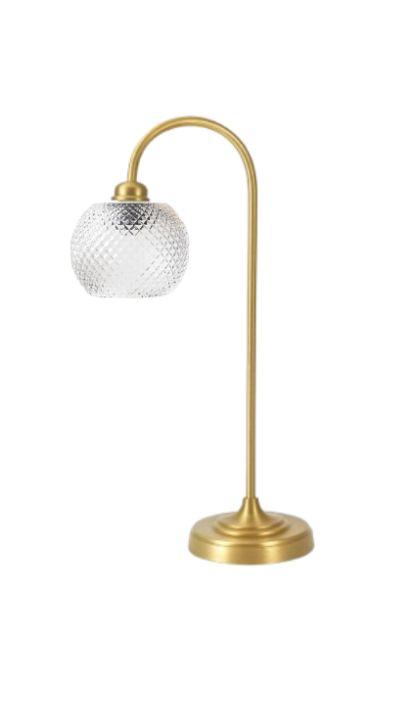 מנורת שולחן דגם טל. מנורת שולחן מעוצבת בסגנון קלאסי-מודרני עם בסיס מתכת מוזהב וזכוכית מחוספסת. פריט דקורטיבי שמפיץ אור נעים ומוסיף טאץ' יוקרתי לכל חלל.