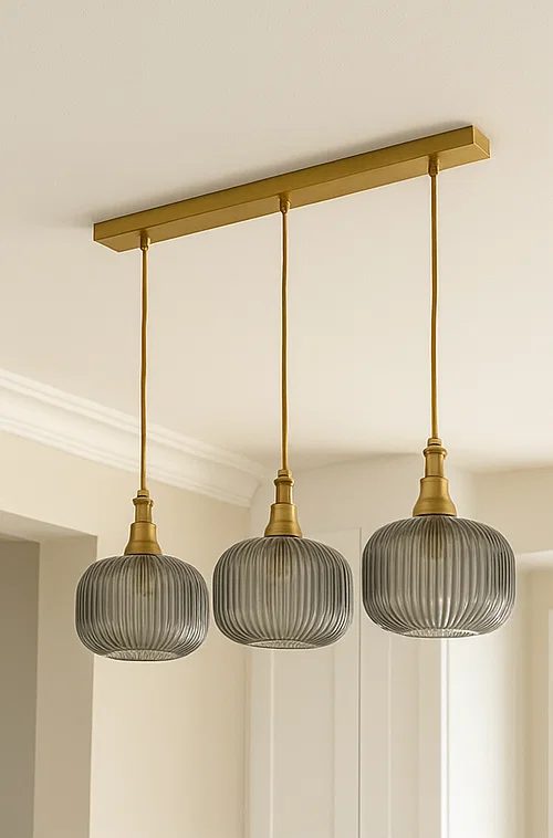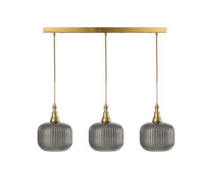 פס נחושת מטר דגם אלין. פס תאורה תלוי עם שלושה אהילי זכוכית מעוצבים וגימור מתכת מוזהב. שילוב של אלגנטיות מודרנית ותאורה חמימה.