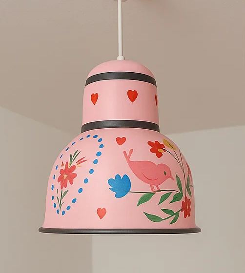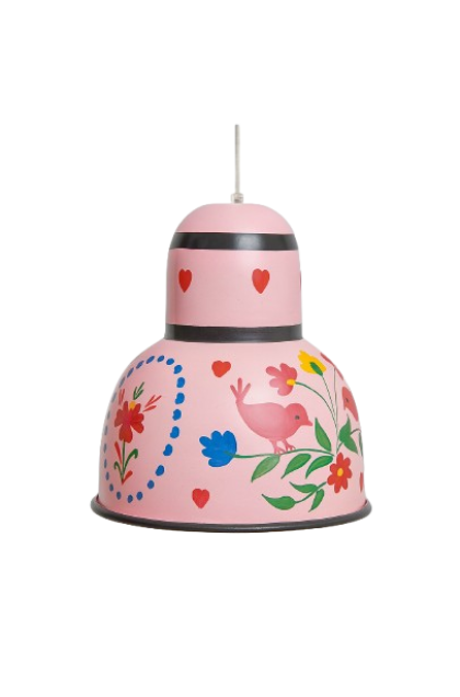 מנורת תלייה דגם אושר. מנורת מתכת ורודה עם ציורי ציפורים ופרחים צבעוניים. מנורה דקורטיבית ייחודית שתוסיף צבע, חמימות ואופי לכל חלל .