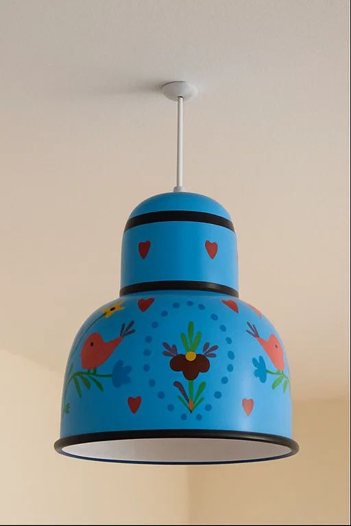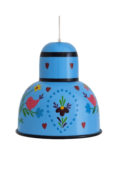 מנורת תלייה דגם תמר. מנורת מתכת כחולה עם ציורי ציפורים ופרחים צבעוניים. מנורה דקורטיבית ייחודית שתוסיף צבע, חמימות ואופי לכל חלל .