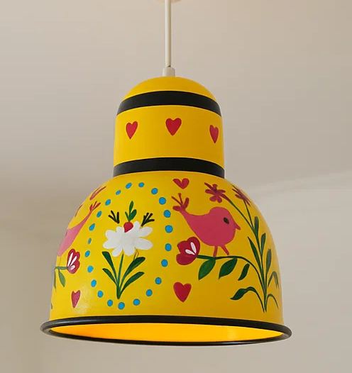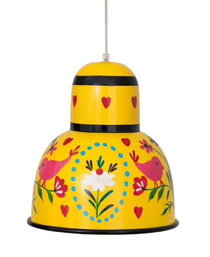מנורת תלייה דגם זיו. מנורת מתכת צהובה עם ציורי ציפורים ופרחים צבעוניים. מנורה דקורטיבית ייחודית שתוסיף צבע, חמימות ואופי לכל חלל .