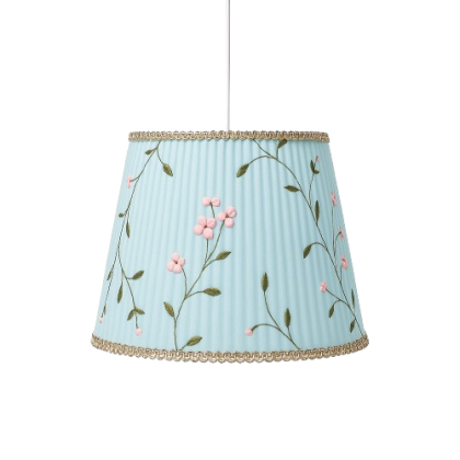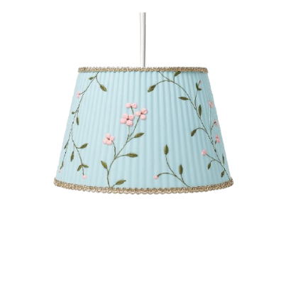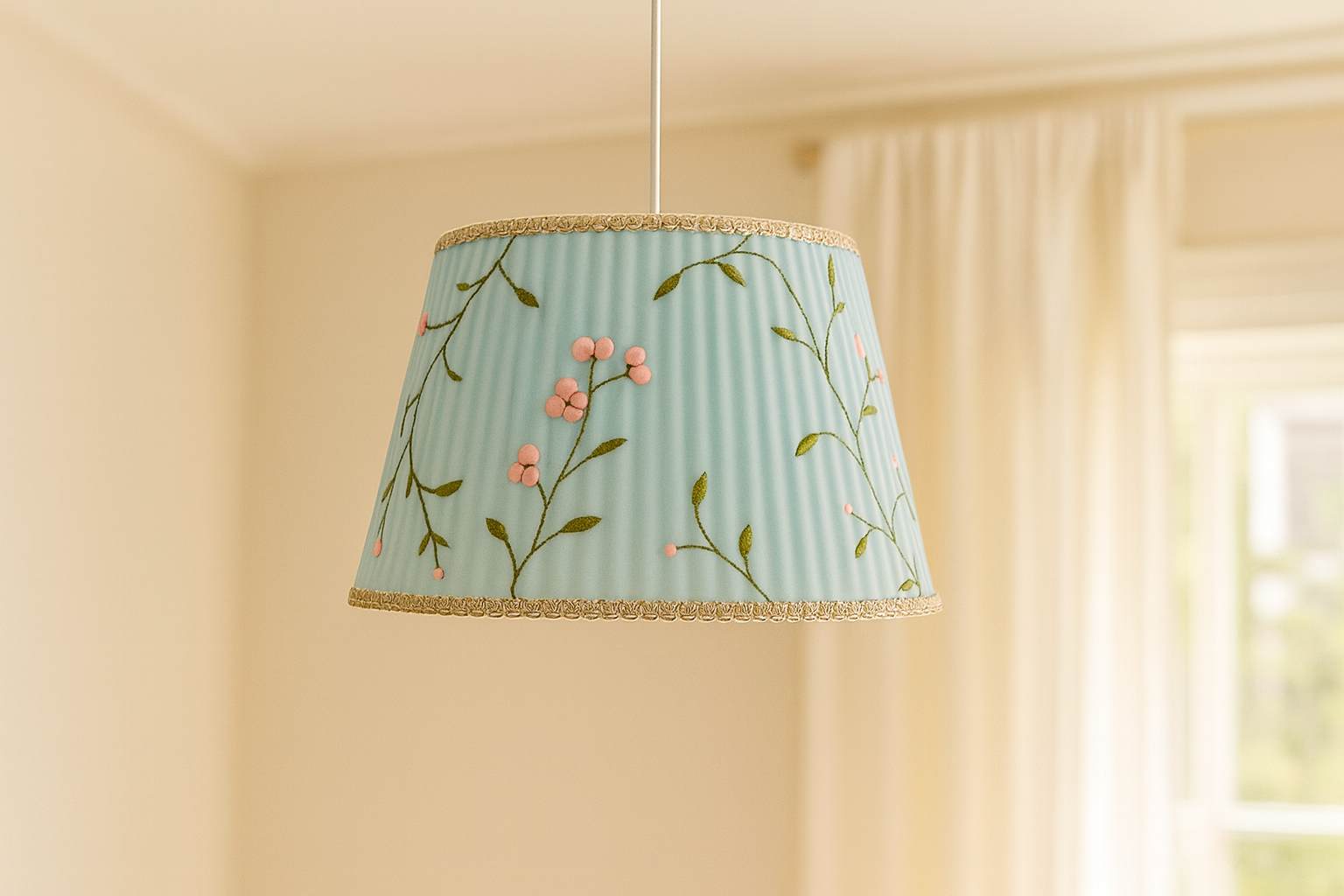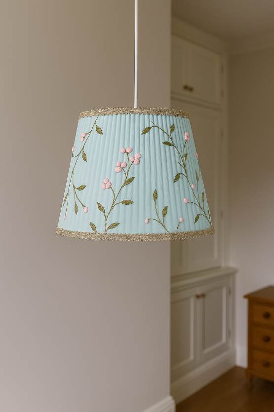 מנורת תקרה בעיצוב רומנטי וקלאסי עם אהיל תכלת רך, מעוטר בפרחי בד ורודים ועלים רקומים בגוון ירוק. מעניקה לחלל מראה חמים, אלגנטי ונשי עם נגיעה של וינטג' עדין.