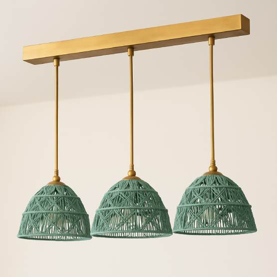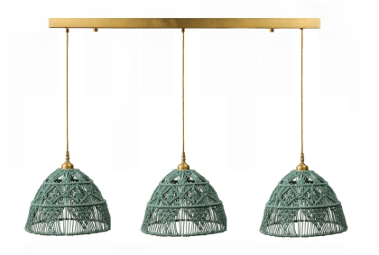 מנורת תקרה תלת ראשית בעיצוב בוהו-מודרני ייחודי. המנורה שלושה אהילים קלועים בגוון טורקיז רך, התלויים מפלטת מתכת יוקרתית. שילוב הצבעים והחומרים יוצר מראה חמים
