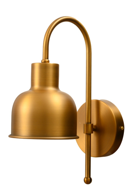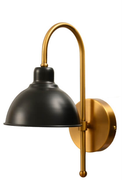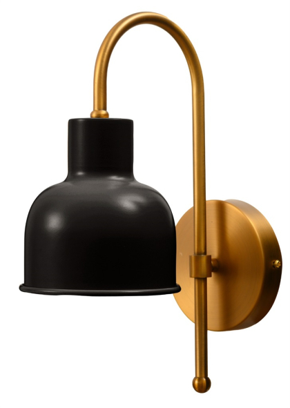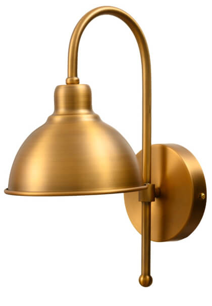 מנורת קיר מעוצבת בסגנון קלאסי עם זרוע קשת בגימור נחושת וכובע מתכת בצורת פעמון.