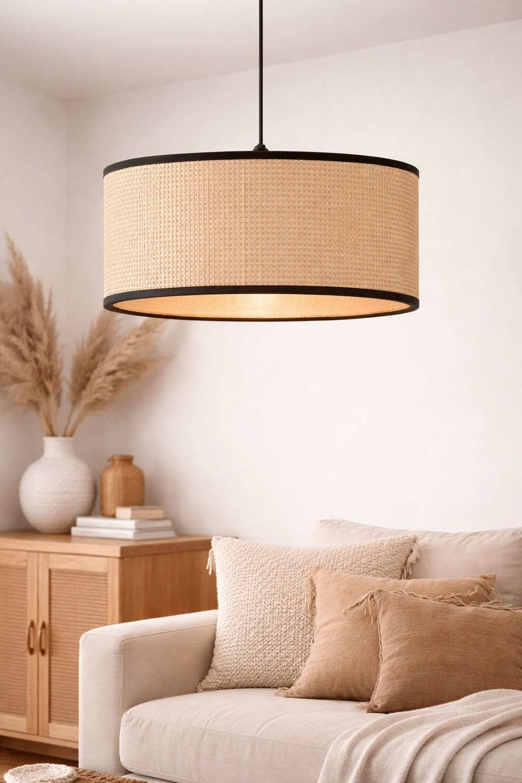 מנורת תלייה טבעית עשויה קש קלוע, בעיצוב נמוך ורחב המעניק מראה חמים ונעים לחלל.