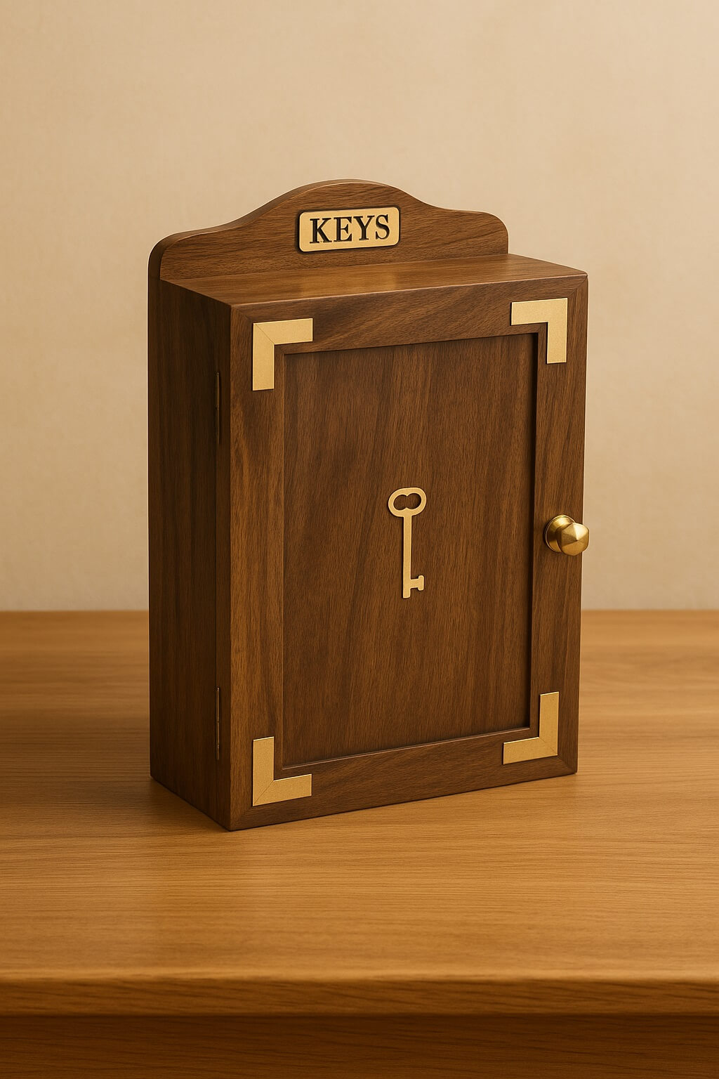 תיבת מפתחות אלגנטית מעץ מלא, בעיצוב חמים בסגנון הודי ובשילוב פרטי מתכת מוזהבת המעניקים לה מראה ייחודי ומרשים. החזית מעוטרת במפתח מוזהב סמלי ובפינות מתכת דקורטיביות, המוסיפות יוקרה ועדינות.