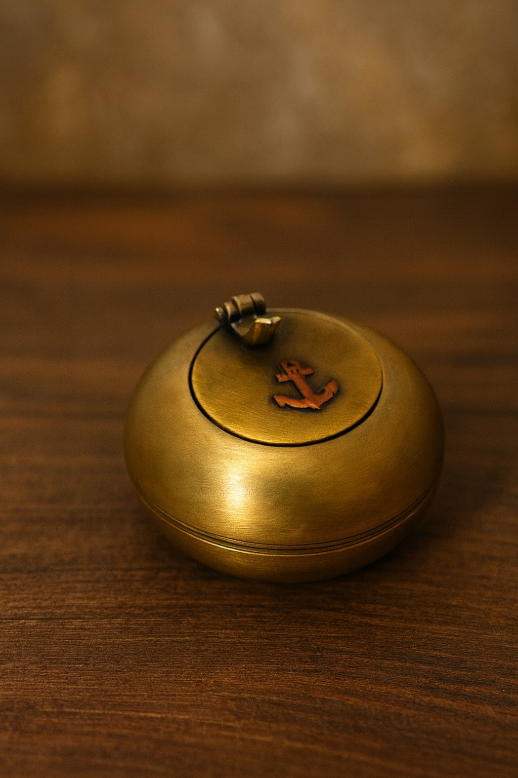 מאפרה עגולה ומעוצבת בעבודת מתכת, עשויה מנחושת בגוון זהב עתיק ומגיעה עם מכסה עליון נוח לפתיחה ולסגירה. על המכסה מוטבע עיטור עוגן עדין המעניק למאפרה טאצ' ימי ואלגנטי. המאפרה קומפקטית, סגורה ושומרת על ניקיון – מושלמת לשימוש בבית, במרפסת, בחצר או כפריט דקורטיבי בעל מראה וינטג'.