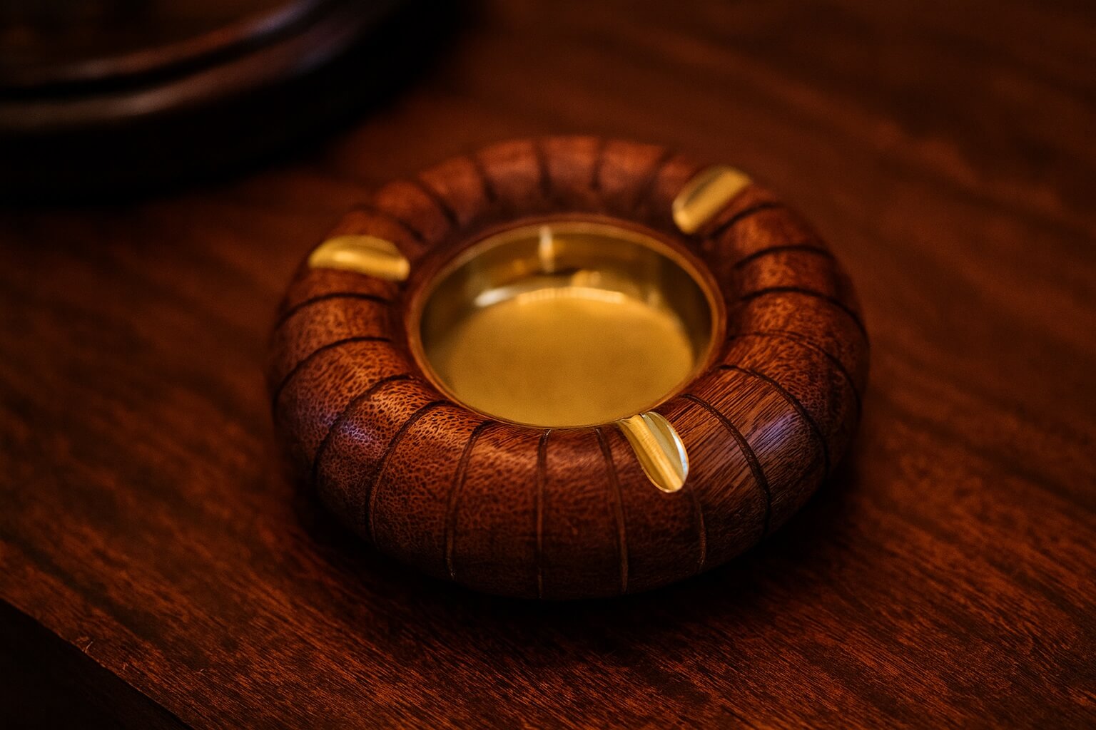 מאפרה מעוצבת בעבודת יד, עשויה משילוב מרהיב של עץ טבעי איכותי וחלק פנימי מצופה מתכת מוזהבת. העיצוב העגול והחריטות העדינות בעץ מעניקים למאפרה מראה יוקרתי, חמים ואלגנטי. מסביב לשוליים משולבים תפסני מתכת לנוחות הנחת הסיגריות.