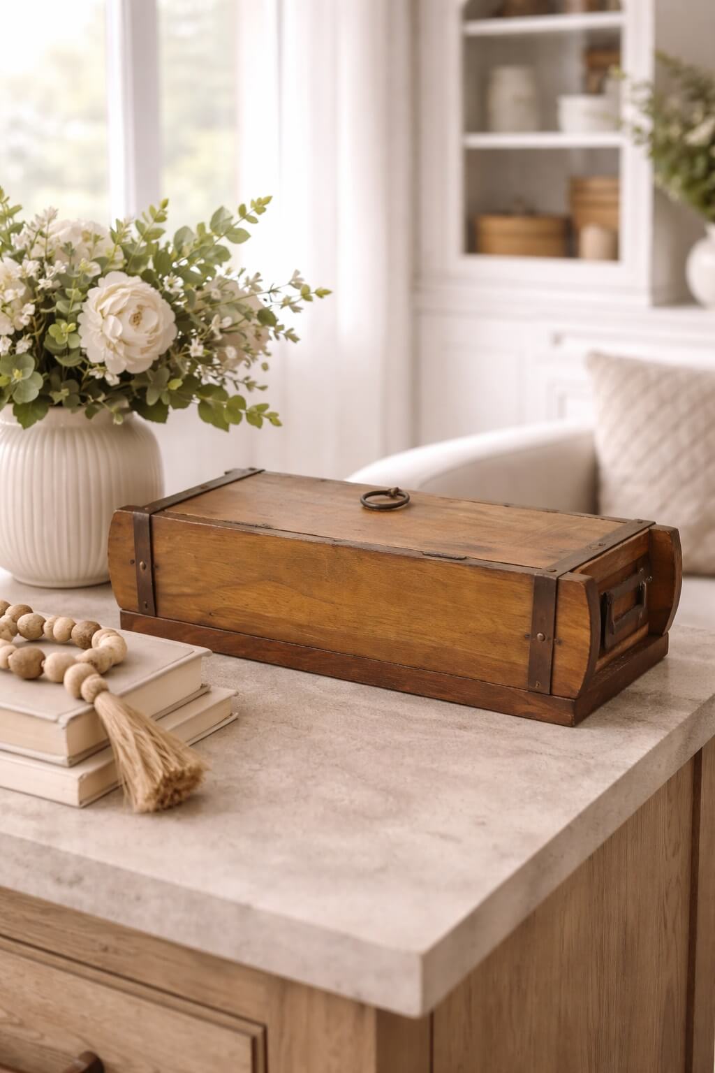 קופסת אחסון מעץ בעיצוב וינטג' קלאסי עם פתיחה עליונה, המשלבת מראה נוסטלגי, חמים ואותנטי. הקופסה עשויה עץ מלא בגימור טבעי עם חיזוקי עץ דקורטיביים וטבעת פתיחה עליונה, המדגישים את אופייה הכפרי   והייחודי.