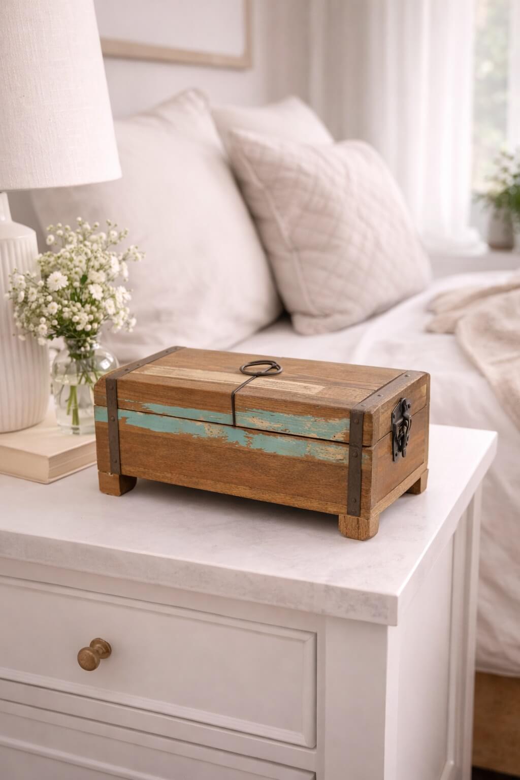 אכסונית מעץ בעיצוב וינטג' ייחודי, המשלבת מראה כפרי מחוספס עם נגיעות צבע עדינות למראה אותנטי ומלא אופי. הקופסה עשויה עץ טבעי, עם גימור מיושן ופס צבע דקורטיבי, וכוללת סגירה קדמית ומראה פנימית –  פתרון מושלם לאחסון פריטים קטנים בצורה אלגנטית ושימושית.