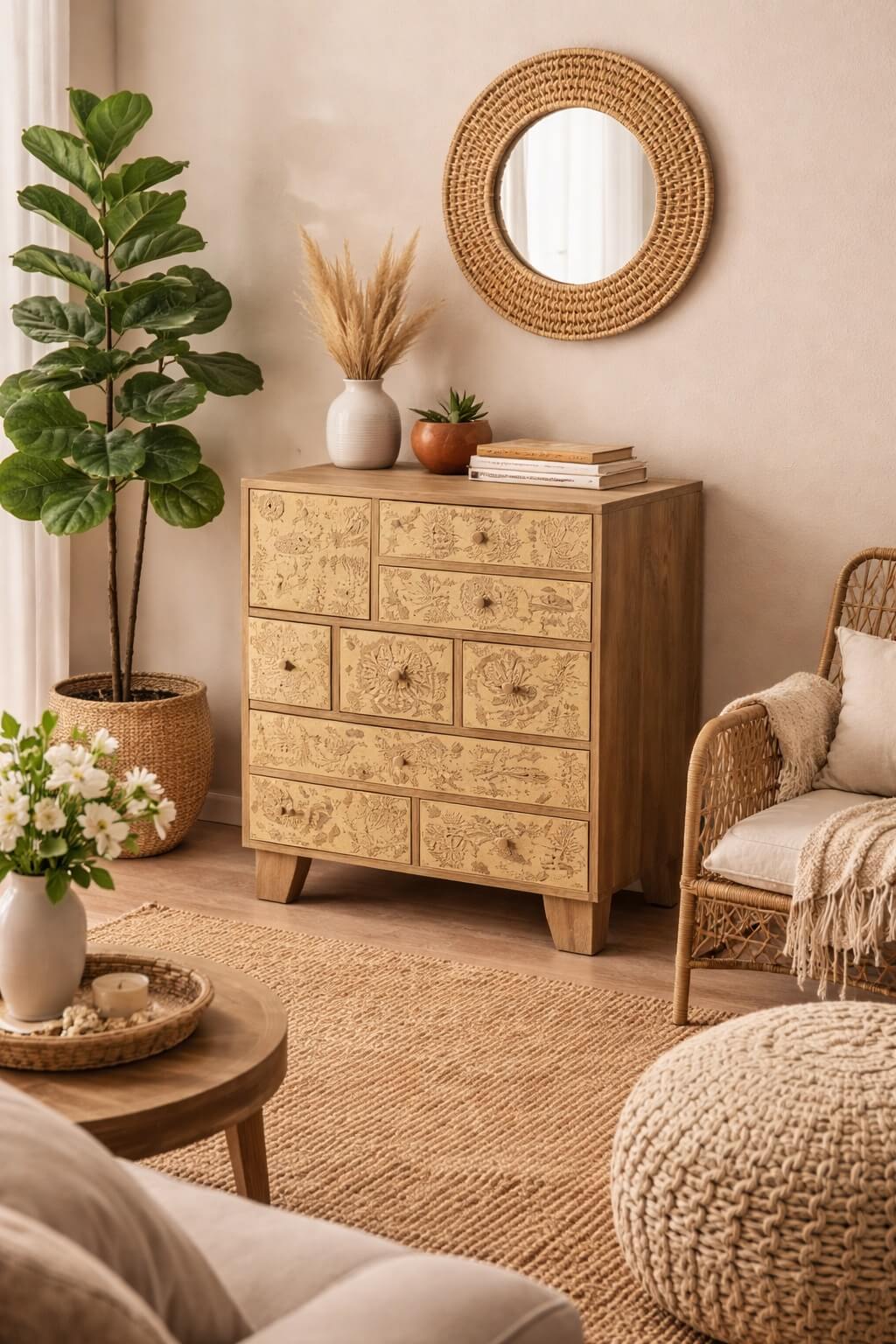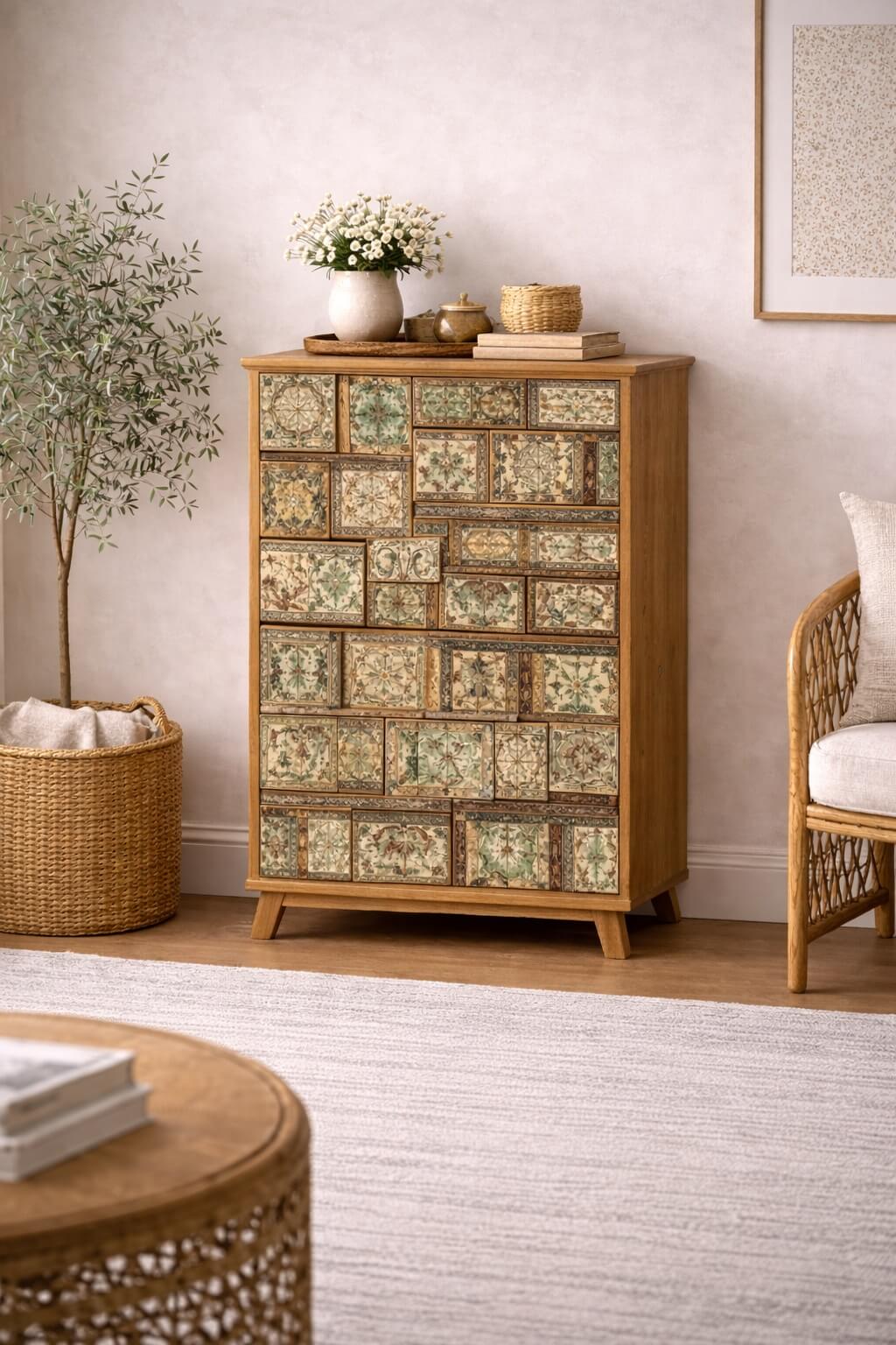 העיצוב משלב השראה וינטג’ית עם נגיעות בוהו ואמנות מסורתית, והופך את השידה לפריט דקורטיבי שמוסיף אופי וחמימות לכל חלל.