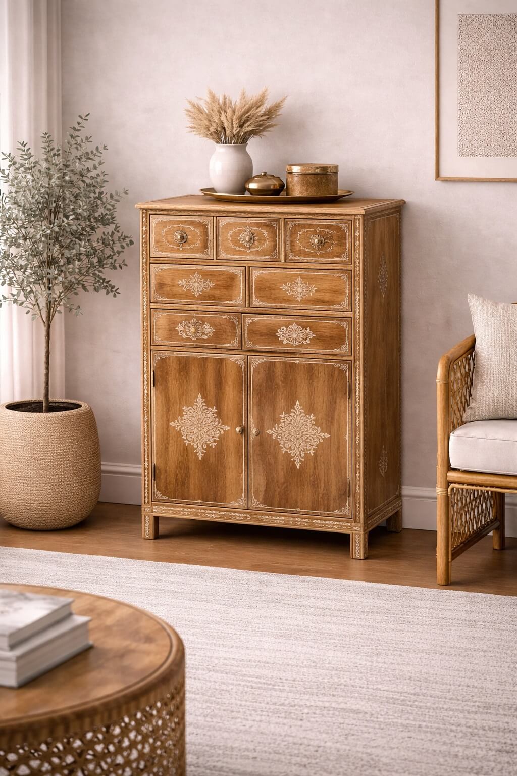 השידה משלבת בין נוחות אחסון לעיצוב ייחודי, ומוסיפה טאץ’ אקזוטי ואותנטי לכל חלל.