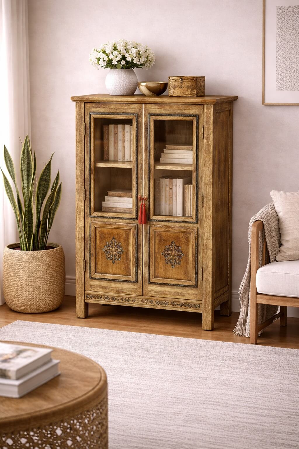 ארון ספרים מעוצב מעץ מלא בעבודת יד, עם שתי דלתות קדמיות ומדפים פנימיים לאחסון וסידור ספרים, כלי נוי וחפצי דקורציה. שילוב של עץ טבעי עם עיטורים עדינים בדלתות מעניק לארון מראה חמים, אתני וייחודי.