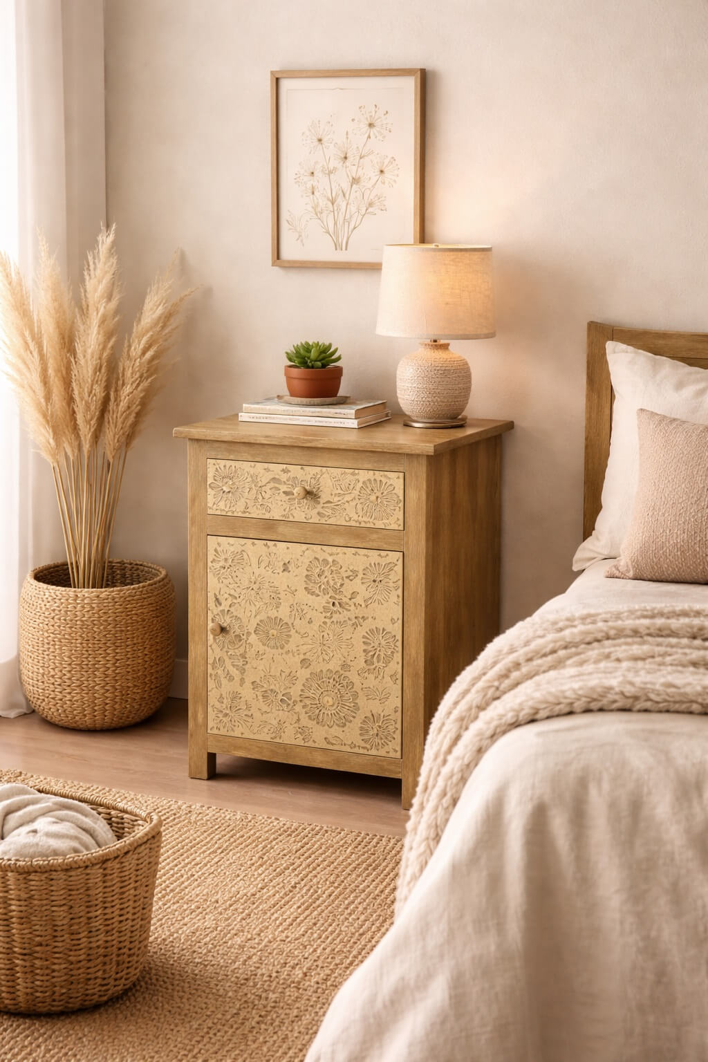 השילוב בין גוון העץ הטבעי לעיטור הדקורטיבי יוצר מראה אלגנטי, חמים ועל־זמני, המתאים לחללים בסגנון כפרי, וינטג’, בוהו או אקלקטי.