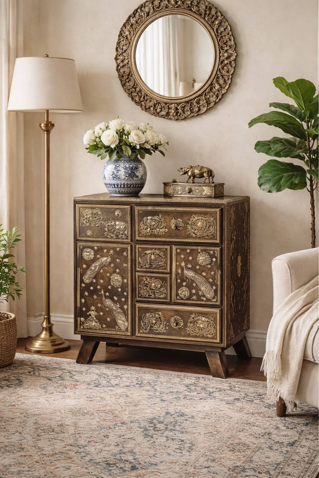 שידת אחסון אלגנטית ומרשימה עשויה עץ מלא, בעיטורים עדינים בעבודת יד ובהשראה אתנית-קלאסית.
