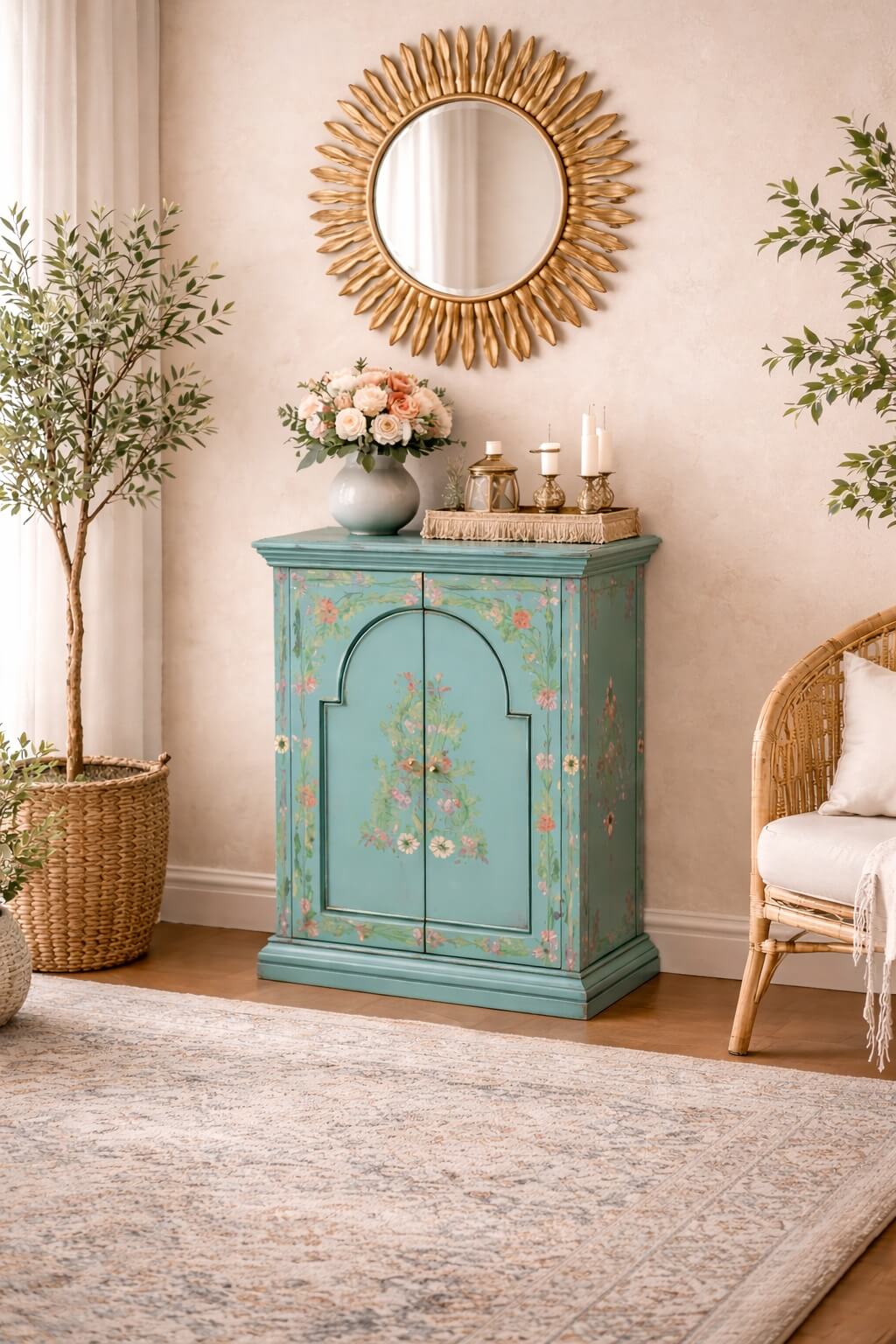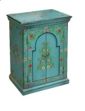 שידת עץ מעוצבת בעבודת יד, עם שתי דלתות ודוגמת פרחים צבעונית על רקע טורקיז מרהיב, המכניסה שמחה, צבע ואופי לכל חלל. פריט מושלם לאוהבי עיצוב ייחודי בסגנון וינטג' ואקלקטי.