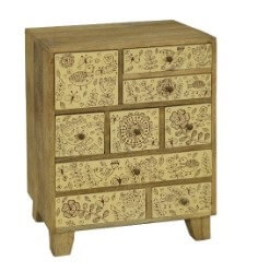 שידת עץ מיוחדת בעבודת יד הכוללת 9 מגירות אחסון, המעוטרות בעיטורים אתניים עדינים בגוונים טבעיים וחמים. פריט דקורטיבי ופונקציונלי המשלב בין אחסון נוח לנראות ייחודית ובעלת אופי.