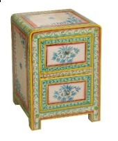 שידת מגירות קומפקטית ומלאת אופי, עשויה עץ מלא ומעוטרת בעבודת יד בדוגמאות פרחוניות צבעוניות ועדינות.