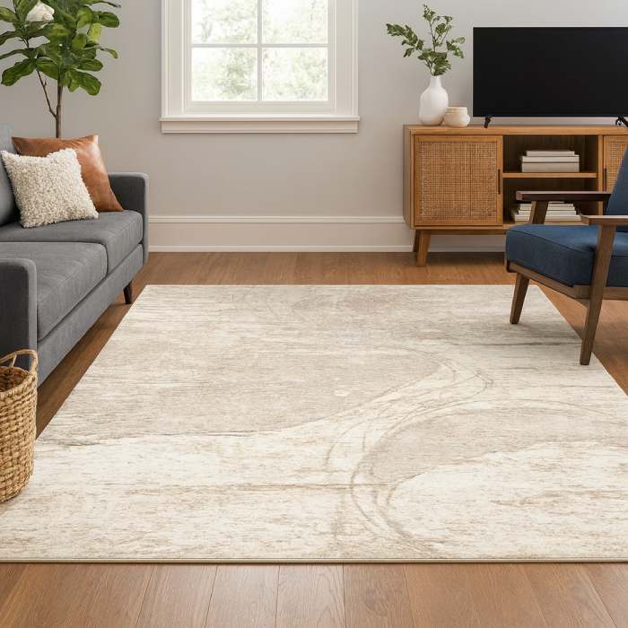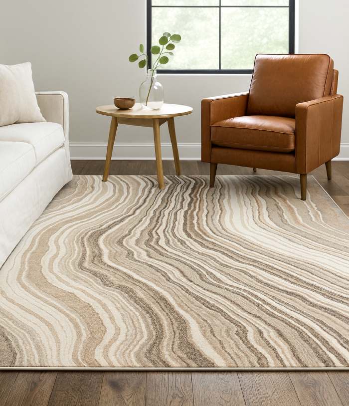 שטיח מודרני מרהיב בעיצוב ייחודי המזכיר טקסטורת אבן טבעית בגווני בז' וחום. הדוגמה הגלית מוסיפה תחושת תנועה ודינמיות לחלל, תוך שמירה על מראה אלגנטי וחמים המשתלב בקלות עם מגוון סגנונות עיצוב – מודרני, סקנדינבי או כפרי.