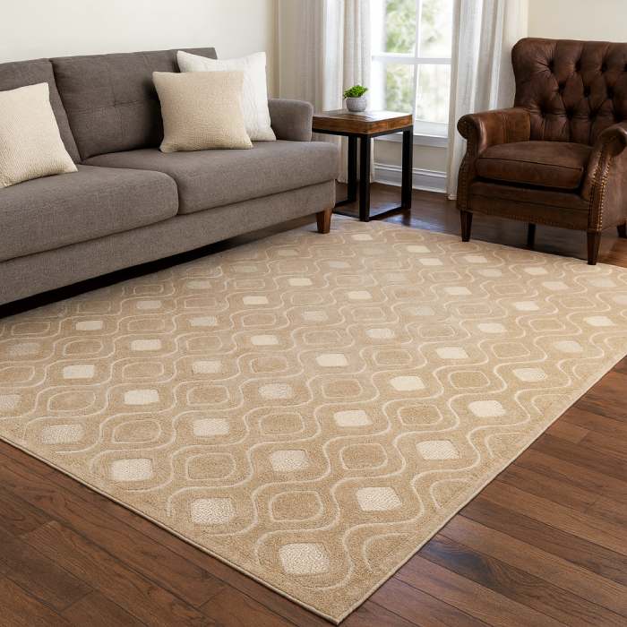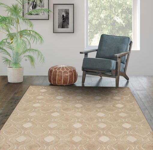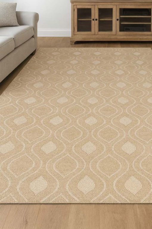 שטיח אלגנטי בעיצוב גיאומטרי עדין בגווני בז' טבעיים. הדוגמה המעוגלת מוסיפה מראה חמים וייחודי, תוך שמירה על קווים נקיים והרמוניים שמשתלבים בצורה מושלמת בכל סגנון עיצוב – מודרני, קלאסי או כפרי.