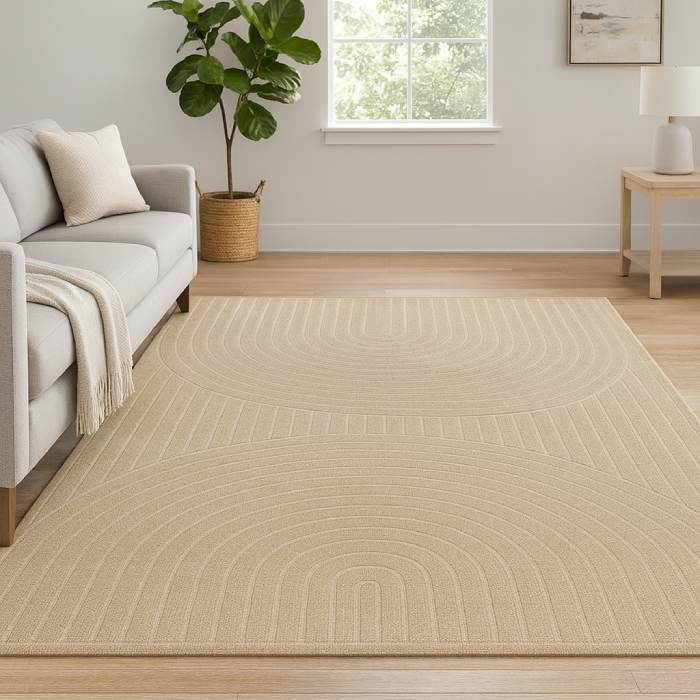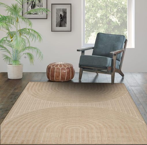 שטיח מודרני בגוון חום־בז' טבעי, עם דוגמת קשתות אלגנטית היוצרת תחושת תנועה ורוגע בחלל. העיצוב המינימליסטי אך המיוחד מעניק מראה יוקרתי ונקי, המתאים לכל סגנון עיצוב – מודרני, סקנדינבי או כפרי.