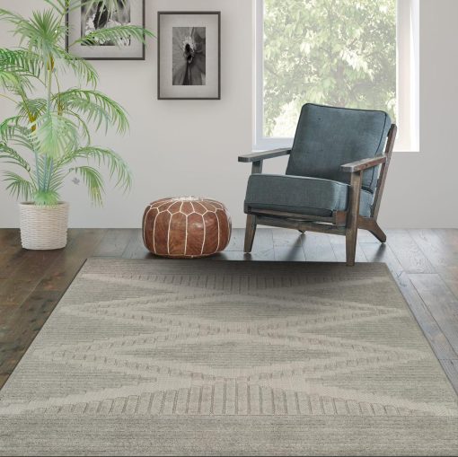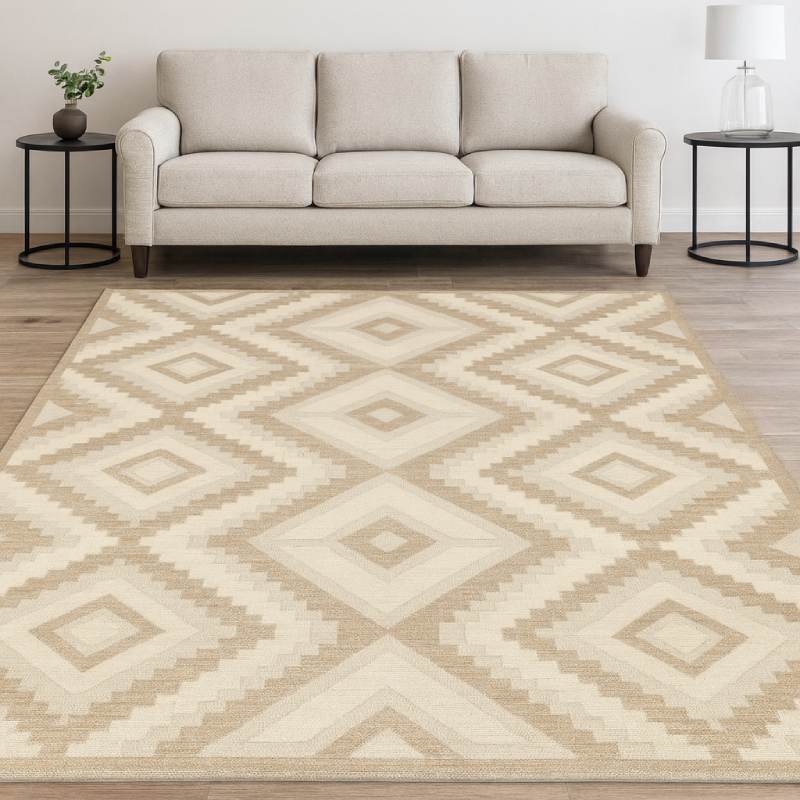 שטיח מודרני בעיצוב גיאומטרי מרהיב, בגווני בז' וחול טבעיים היוצרים מראה חמים ונקי. הדוגמה היהלומית מעניקה תחושת עומק ועיצוב אלגנטי שמתאים כמעט לכל חלל – מסלון ופינת אוכל ועד חדר שינה.