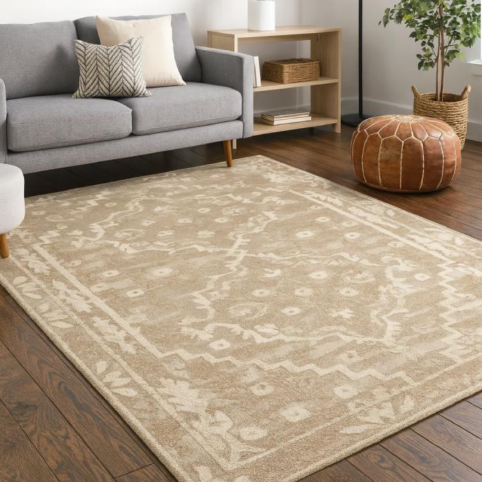 שטיח קלאסי־מודרני בעיצוב אתני עדין בגווני בז' טבעיים. הדוגמה העשירה משתלבת בהרמוניה עם הצבעים הרכים ומעניקה לחלל תחושת חום, אלגנטיות ויוקרה. בזכות המראה המאוזן שלו, השטיח מתאים כמעט לכל סגנון עיצוב – מודרני, כפרי או קלאסי.