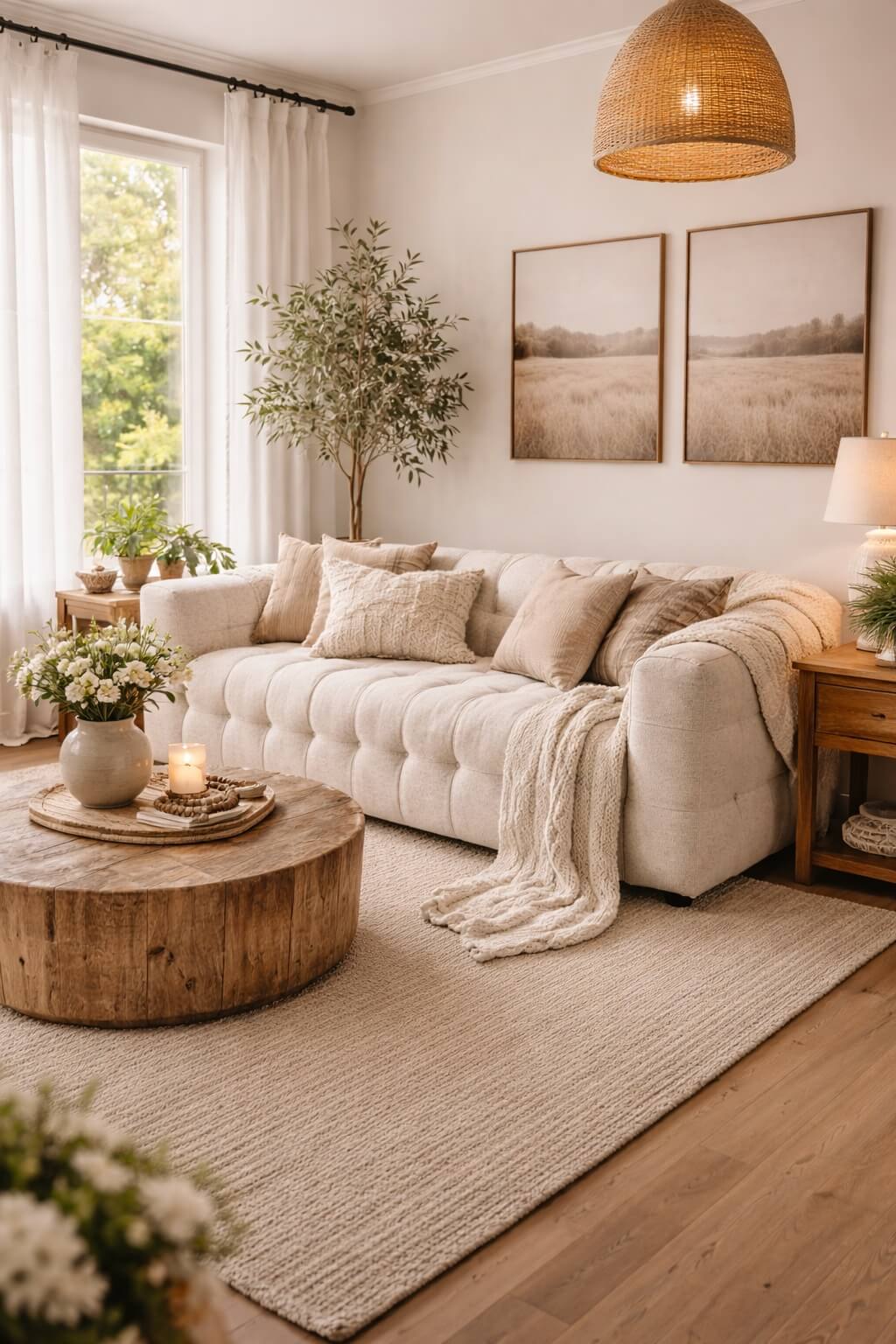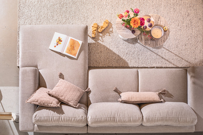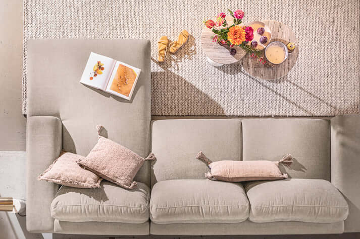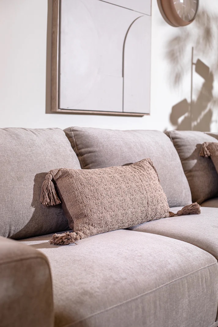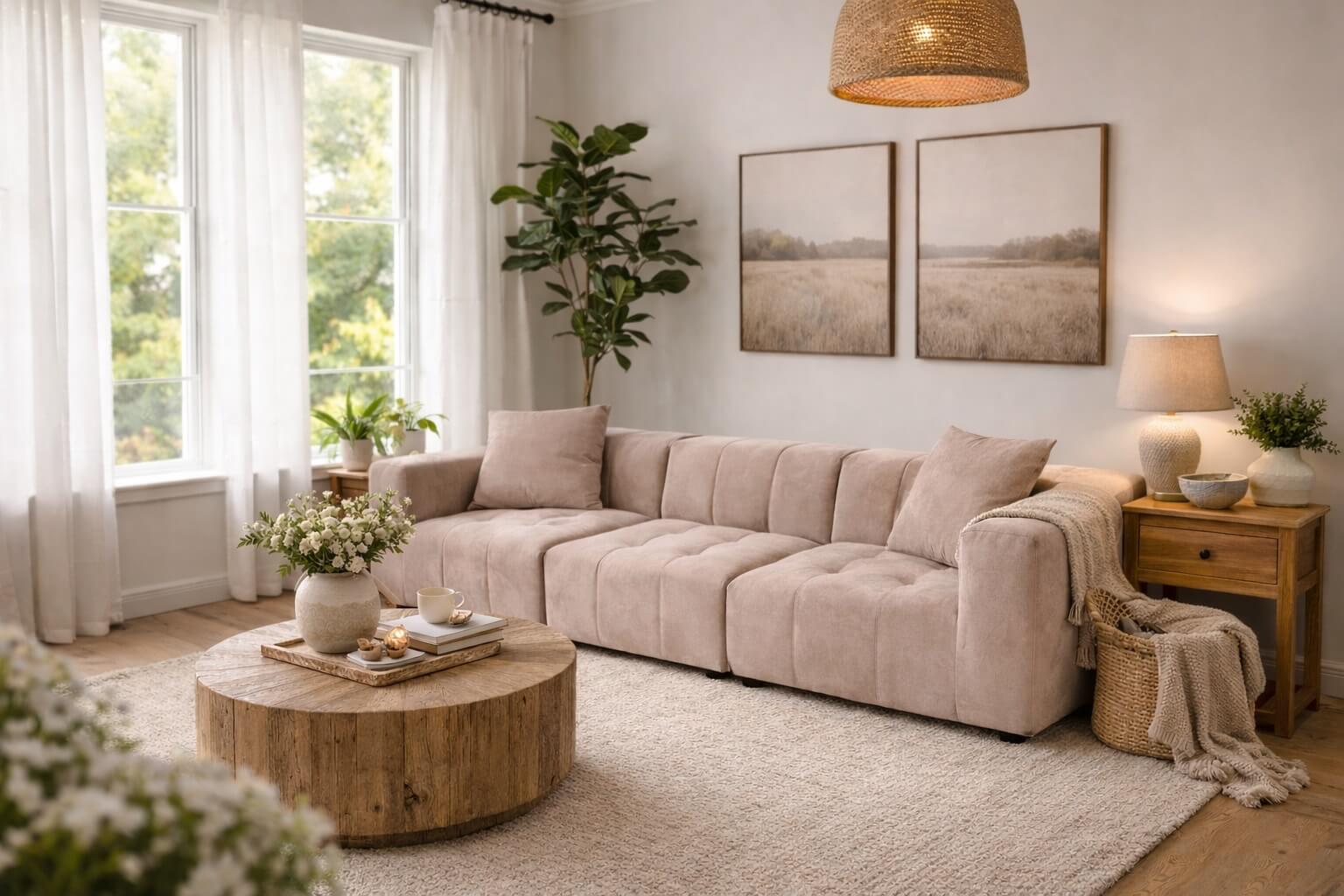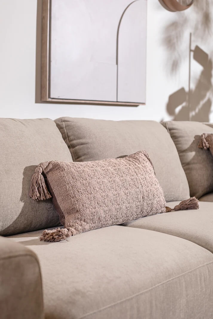 ספה דגם אליאנה. ספה מודרנית בעיצוב מעוגל וייחודי עם ריפוד בד איכותי בגוון טבעי. מעניקה שילוב מושלם של נוחות וסטייל, אידיאלית לסלון מעוצב ואירוח אלגנטי.
