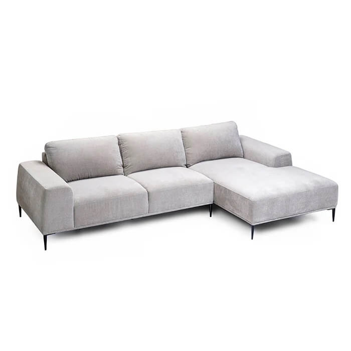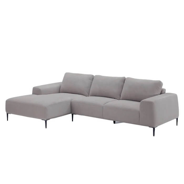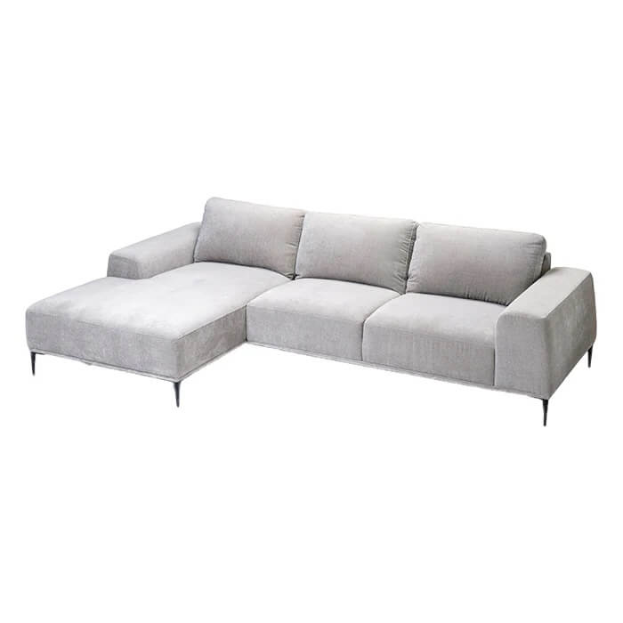 ספת ישיבה קלואי פרופיל מלבני, קצה שמאלי מוארך בגוון אפור. ספת אירוח רחבת ידיים מרופדת הנישאת על רגלי מתכת בצבע שחור. ספה מושלמת לחללי אירוח גדולים ב-קו עכשווי. *לתשומת ליבך, הגדרת מיקום השזלונג בספה, מתייחסת לנקודת מבט פרונטלית ולא מנקודת מבט של היושב.ת עליה.