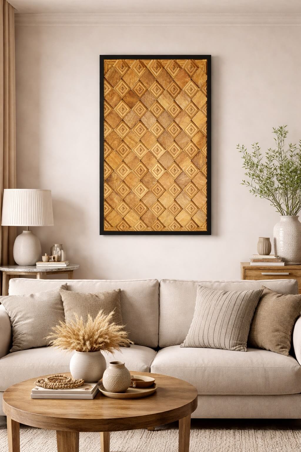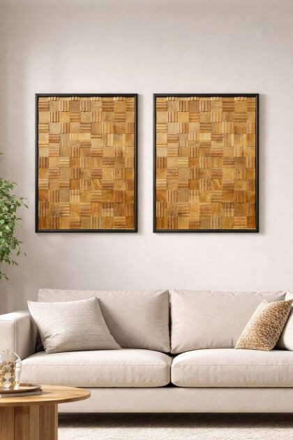 המסגרת השחורה מדגישה את גווני העץ החמים ויוצרת קונטרסט אלגנטי, מה שהופך את המשרביה לפריט אמנות קיר דומיננטי אך הרמוני. מתאימה במיוחד לסלון, פינת אוכל, מסדרון רחב או קיר מרכזי בבית.