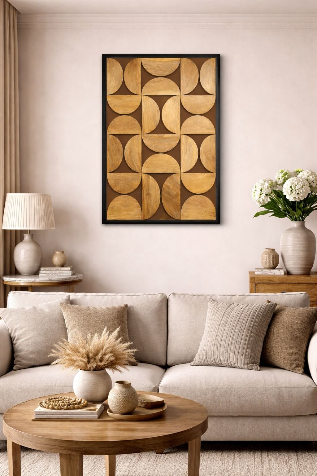 משרביה מלבנית מדגם סוליד, בעיצוב גאומטרי נקי ומאוזן המורכב מאלמנטים חצי־עגולים היוצרים קומפוזיציה מודרנית, רגועה ועל־זמנית. השילוב בין גווני העץ הטבעיים לרקע החם והמסגרת השחורה מעניק עומק ותחושת סדר אלגנטית, מבלי להעמיס על החלל.