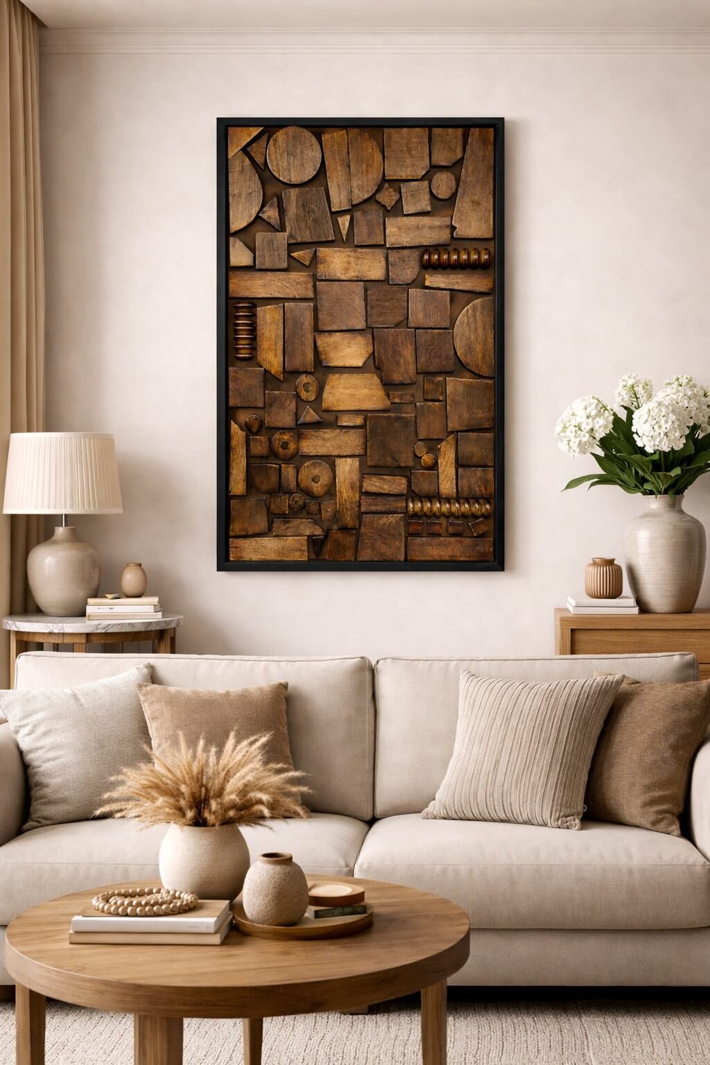 המשחק בין גבהים, עומקים וגווני עץ חמים מעניק תחושת תנועה וחומריות חזקה, והמסגרת השחורה מדגישה את היצירה והופכת אותה לנקודת מוקד מרשימה בכל חלל. מתאימה במיוחד לסלון, משרד, פינת אוכל או חלל מסחרי המעוניין בנוכחות עיצובית חזקה וייחודית.
