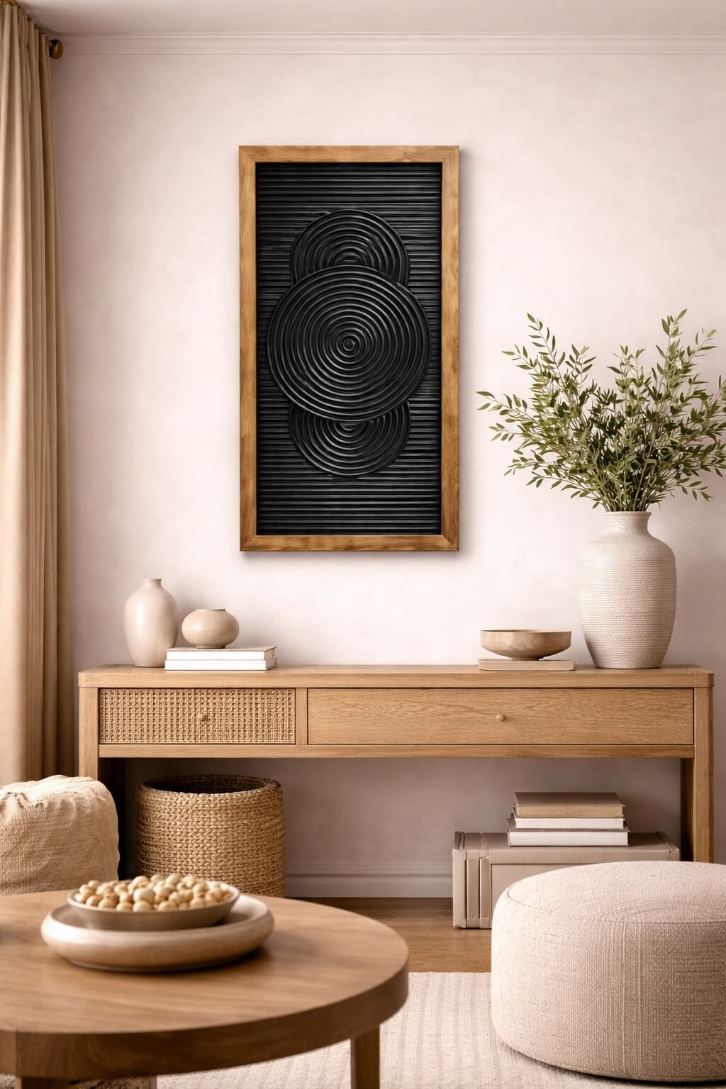 הקונטרסט בין המרכז השחור המחורץ לבין מסגרת העץ החמה מעניק מראה מודרני אך טבעי, כזה שמתאים גם לעיצוב אורבני וגם לחללים בסגנון חמים ועכשווי. פריט מושלם לקיר כניסה, מסדרון, פינת אוכל או כתוספת דקורטיבית לחלל מגורים.