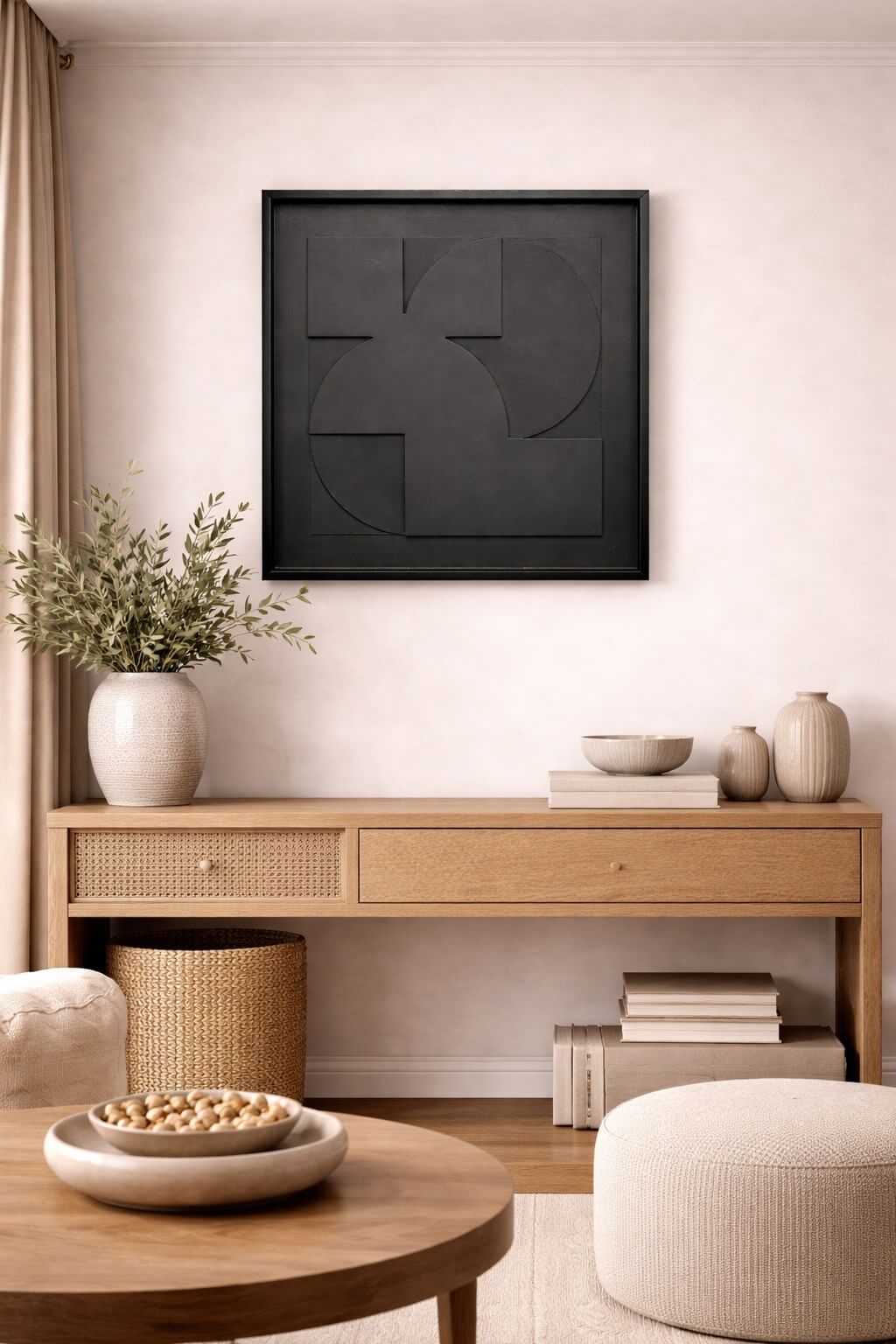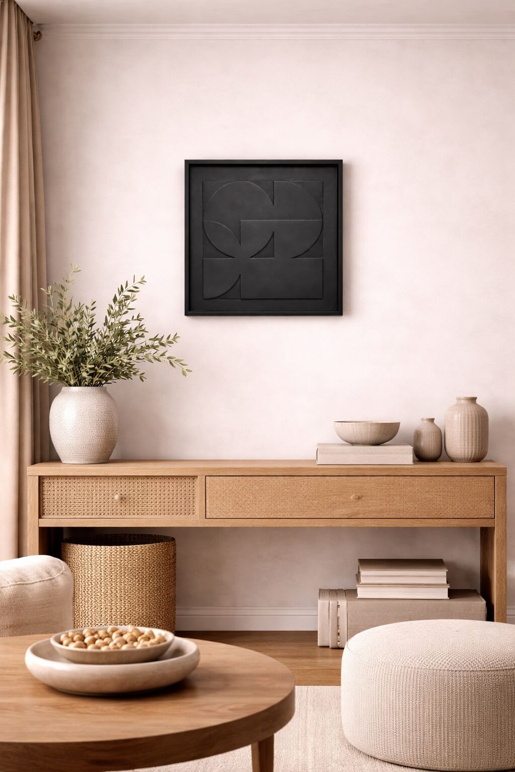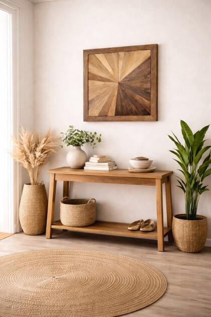 המסגרת הכהה מדגישה את גווני העץ המדבריים ויוצרת נוכחות אלגנטית ומרשימה, המתאימה במיוחד לחללים מודרניים, בוהו־שיק, כפריים ואורבניים.