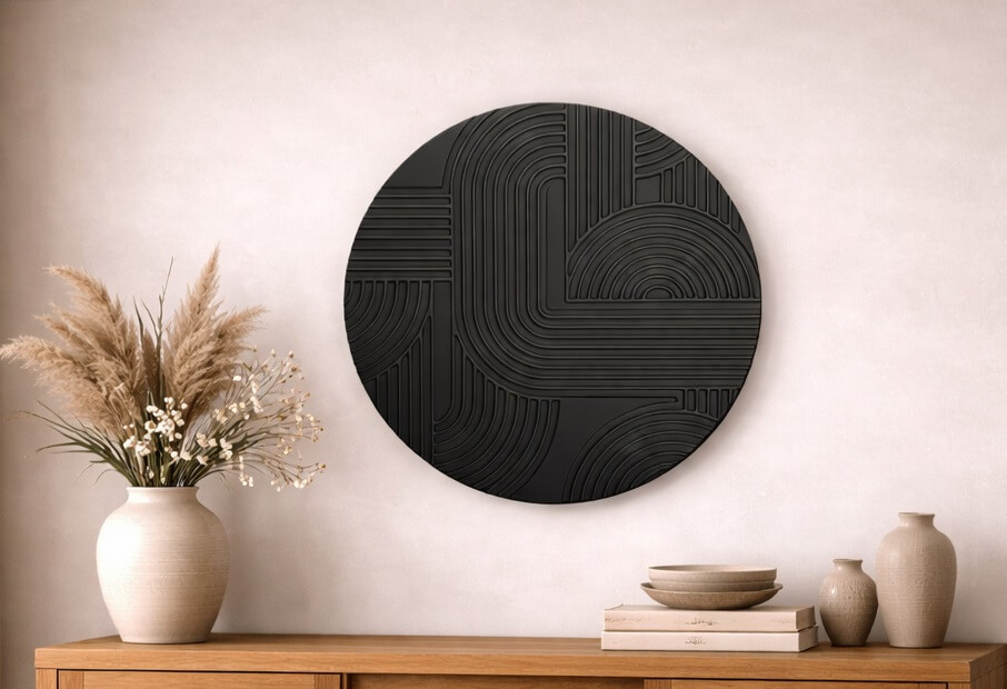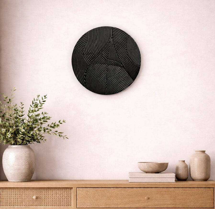 משרביה עגולה בעיצוב סטריפס מודרני, עם חריטות קווים מעוגלים היוצרות תנועה, עומק וטקסטורה ייחודית. הגימור השחור האלגנטי מעניק מראה דרמטי, עכשווי ויוקרתי, כזה שמושך את העין אך נשאר מאוזן ונקי.