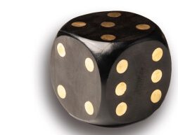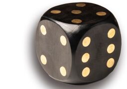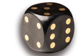 קוביית משחק דקורטיבית מעץ בצבע שחור עם נקודות מוזהבות – פריט ייחודי שמשלב אלגנטיות ומשחקיות בעיצוב הבית.