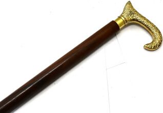 גוף עץ טבעי מלא עם גימור חלק ומבריק ידית מתכת מוזהבת עם חריטה דקורטיבית מהממת מראה מלכותי, יוקרתי ואצילי אידיאלי לאספנים, אוהבי וינטג', עיצוב קלאסי ואביזרי במה פריט דקורטיבי ייחודי שמשדר סטייל ונוכחות