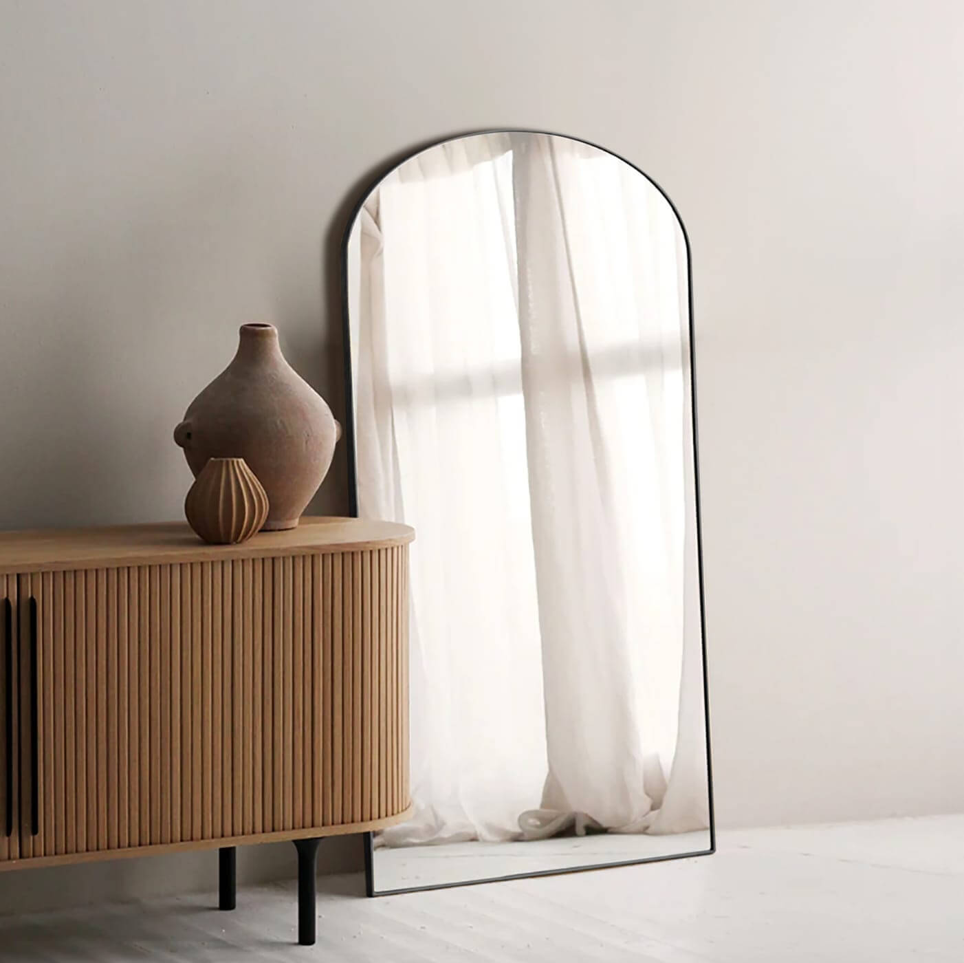 מראה מרהיבה בעיצוב מודרני ונקי, עם חלק עליון מעוגל המשווה לחלל תחושת רכות ואלגנטיות. המסגרת הדקה בגוון שחור מט מעניקה למראה מראה יוקרתי ומינימליסטי, ומתאימה בקלות לכל סגנון עיצוב – מודרני, אורבני, סקנדינבי או קלאסי.